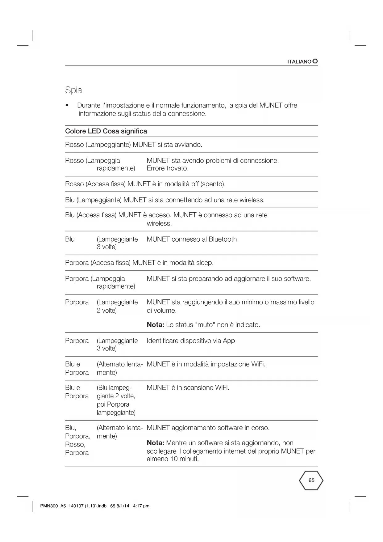 - Durante l'impostazione e il normale funzionamento, la spia del MUNET ore informazione sugli status della connessione. Colore LED Cosa significa Rosso (Lampeggiante) MUNET si sta avviando. Rosso (Lampeggia rapidamente) MUNET sta avendo problemi di connessione. Errore trovato. Rosso (Accesa fissa) MUNET è in modalità o (spento). Blu (Lampeggiante) MUNET si sta connettendo ad una rete wireless. Blu (Accesa fissa) MUNET è acceso. MUNET è connesso ad una rete wireless. Blu (Lampeggiante 3 volte) MUNET connesso al Bluetooth. Porpora (Accesa fissa) MUNET è in modalità sleep. Porpora (Lampeggia rapidamente) MUNET si sta preparando ad aggiornare il suo software. Porpora (Lampeggiante 2 volte) MUNET sta raggiungendo il suo minimo o massimo livello di volume. Nota: Lo status "muto" non è indicato. Porpora (Lampeggiante 3 volte) Identificare dispositivo via App Blu e Porpora (Alternato lenta- mente) MUNET è in modalità impostazione WiFi. Blu e Porpora (Blu lampeg- giante 2 volte, poi Porpora lampeggiante) MUNET è in scansione WiFi. Blu, Porpora, Rosso, Porpora (Alternato lenta- mente) MUNET aggiornamento software in corso. Nota: Mentre un software si sta aggiornando, non scollegare il collegamento internet del proprio MUNET per almeno 10 minuti. PMN300_A5_140107 (1.10).indb 65 8/1/14 4:17 pmITALIANO