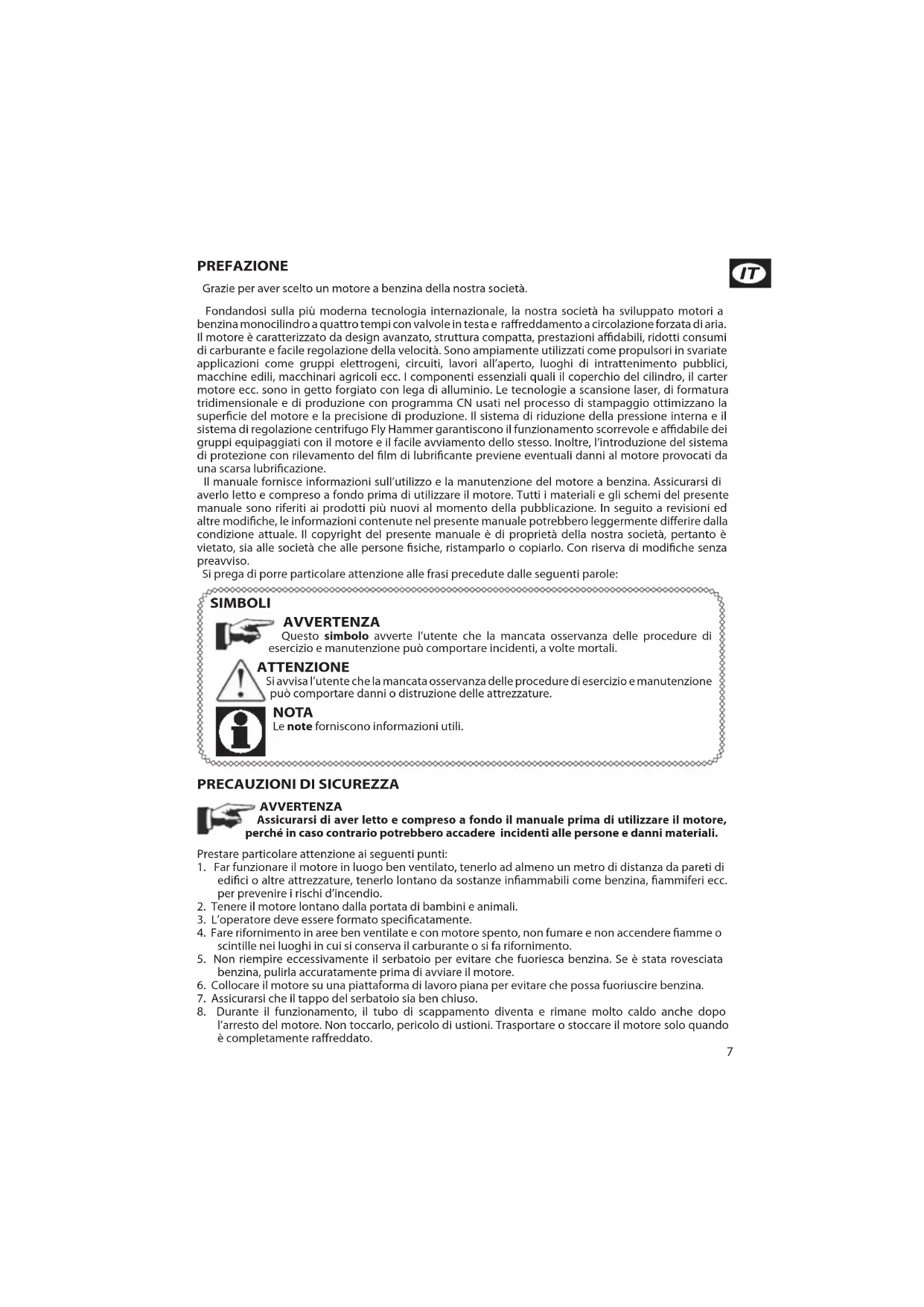 PREFAZIONE Grazie per aver scelto un motore a benzina della nostra società. Fondandosi sulla più moderna tecnologia internazionale, la nostra società ha sviluppato motori a benzina monocilindro a quattro tempi con valvole in testa e raffreddamento a circolazione forzata di aria. Il motore è caratterizzato da design avanzato, struttura compatta, prestazioni affidabili, ridotti consumi di carburante e facile regolazione della velocità. Sono ampiamente utilizzati come propulsori in svariate applicazioni come gruppi elettrogeni, circuiti, lavori all’aperto, luoghi di intrattenimento pubblici, macchine edili, macchinari agricoli ecc. I componenti essenziali quali il coperchio del cilindro, il carter motore ecc. sono in getto forgiato con lega di alluminio. Le tecnologie a scansione laser, di formatura tridimensionale e di produzione con programma CN usati nel processo di stampaggio ottimizzano la superficie del motore e la precisione di produzione. Il sistema di riduzione della pressione interna e il sistema di regolazione centrifugo Fly Hammer garantiscono il funzionamento scorrevole e affidabile dei gruppi equipaggiati con il motore e il facile avviamento dello stesso. Inoltre, l’introduzione del sistema di protezione con rilevamento del film di lubrificante previene eventuali danni al motore provocati da una scarsa lubrificazione. Il manuale fornisce informazioni sull’utilizzo e la manutenzione del motore a benzina. Assicurarsi di averlo letto e compreso a fondo prima di utilizzare il motore. Tutti i materiali e gli schemi del presente manuale sono riferiti ai prodotti più nuovi al momento della pubblicazione. In seguito a revisioni ed altre modifiche, le informazioni contenute nel presente manuale potrebbero leggermente differire dalla condizione attuale. Il copyright del presente manuale è di proprietà della nostra società, pertanto è vietato, sia alle società che alle persone fisiche, ristamparlo o copiarlo. Con riserva di modifiche senza preavviso. Si prega di porre particolare attenzione alle frasi precedute dalle seguenti parole:
