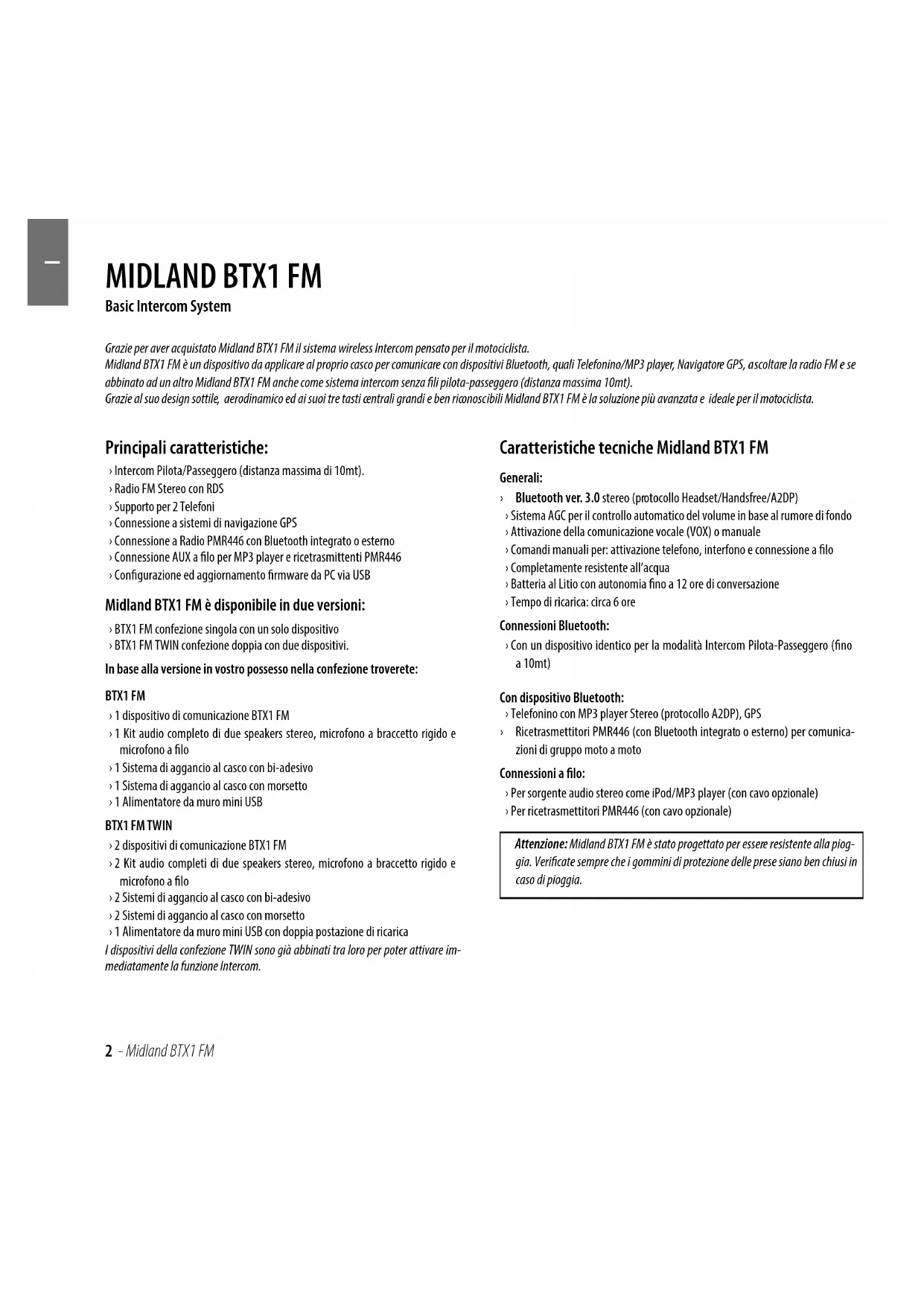 Principali caratteristiche: › Intercom Pilota/Passeggero (distanza massima di 10mt). › Radio FM Stereo con RDS › Supporto per 2 Telefoni › Connessione a sistemi di navigazione GPS › Connessione a Radio PMR446 con Bluetooth integrato o esterno › Connessione AUX a lo per MP3 player e ricetrasmittenti PMR446 › Congurazione ed aggiornamento rmware da PC via USB Midland BTX1 FM è disponibile in due versioni: › BTX1 FM confezione singola con un solo dispositivo › BTX1 FM TWIN confezione doppia con due dispositivi.In base alla versione in vostro possesso nella confezione troverete:BTX1 FM › 1 dispositivo di comunicazione BTX1 FM › 1 Kit audio completo di due speakers stereo, microfono a braccetto rigido e microfono a lo › 1 Sistema di aggancio al casco con bi-adesivo › 1 Sistema di aggancio al casco con morsetto › 1 Alimentatore da muro mini USBBTX1 FM TWIN › 2 dispositivi di comunicazione BTX1 FM › 2 Kit audio completi di due speakers stereo, microfono a braccetto rigido e microfono a lo › 2 Sistemi di aggancio al casco con bi-adesivo › 2 Sistemi di aggancio al casco con morsetto › 1 Alimentatore da muro mini USB con doppia postazione di ricaricaI dispositivi della confezione TWIN sono già abbinati tra loro per poter attivare im-mediatamente la funzione Intercom. Caratteristiche tecniche Midland BTX1 FM Generali: › Bluetooth ver. 3.0 stereo (protocollo Headset/Handsfree/A2DP) › Sistema AGC per il controllo automatico del volume in base al rumore di fondo › Attivazione della comunicazione vocale (VOX) o manuale › Comandi manuali per: attivazione telefono, interfono e connessione a lo › Completamente resistente all’acqua › Batteria al Litio con autonomia no a 12 ore di conversazione › Tempo di ricarica: circa 6 oreConnessioni Bluetooth: › Con un dispositivo identico per la modalità Intercom Pilota-Passeggero (no a 10mt)