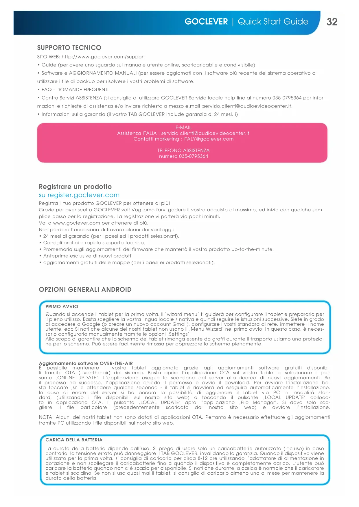 - Informazionisullagaranzia(ilvostroTABGOCLEVERincludegaranziadi24mesi.i) E-MAIL Assistenza ITALIA : servizio.clienti@audioevideocenter.it Contatti marketing : ITALY@goclever.com TELEFONO ASSISTENZA numero 035-0795364