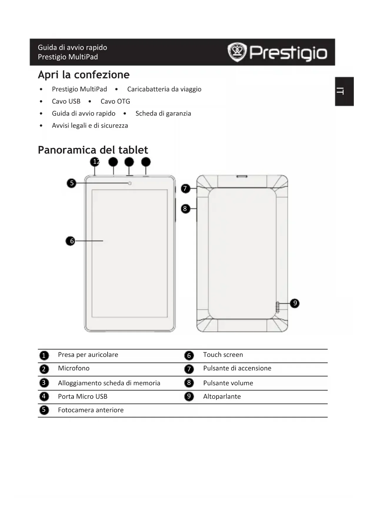 - SullaschermataHomeosulmenuprincipale,selezionarel'iconadiun'appperaprirla. Connessione a Internet ConnettersiaInternettramitereteWi-Fi(sedisponibile)ounachiavetta3Gconnessaconun cavoOTG. Connessione a una rete wireless ConnettereildispositivoaunareteWi-FiperutilizzareInternetocondividerefilemultimediali conaltridispositivi.PerutilizzareilWi-Fi,ènecessarioaccedereaunpuntowirelessohotspot. 1.Sullaschermatahomeoilmenuelenco,toccareImpostazioni,quinditoccareWi-Fiper attivarlo. 2.LeretiWi-FirilevatesarannoelencatenellasezioneretiWi-Fi. 3.ToccarelareteWi-Fiacuisidesideraconnettersi. Sesièselezionataunareteprotetta,verràrichiestodiinserirelachiaveopassworddirete. Specifiche tecniche Voce Specifica Processore DualCoreARMCortexA9 Memoria 8GBFlash+1GBDDR3,l'alloggiamentomicroSDsupportafinoa32GB Frequenza 1,0GHz GPU Mali400MP,400MhzIT Guida di avvio rapido Prestigio MultiPad Display 7”rapporto16:9TN,pannellomulti-touchcapacitivo(supportafinoa 5punti) Risoluzione 1024*600Pixel Interfacce MicroUSB2.0,microSD(compatibileconmicroSDHC) Comunicazioni Wi-Fi(802.11b/g/n) Bluetooth SupportoperBluetooth3.0 Fotocamera Anteriore0,3MP Batteria 3500mAhBatteriaaipolimeridilitio Dimensioni 190,6*110,5*9,3mm Peso 274g(conbatteria)(circa) SiccomeiprodottiPrestigiovengonocontinuamenteaggiornatiemigliorati,il softwareel'hardwaredeldispositivopotrebberoavereunaspettoleggermente diversoofunzionalitàmodificaterispettoaquellepresentatenellapresenteGuida diAvvioRapido. ConlapresentePrestigiodichiarachequestoMultiPadèconformeairequisitidibaseealle altrenormativeapplicabiliprevistedalladirettivaUE1999/5/CE.Laversionecompletadella dichiarazionediconformitàèdisponibileall'indirizzo: http://www.prestigio.com/compliance. Perprevenirepossibilidanniall'udito,nonascoltarealivellidivolumeelevatoper periodiprolungati.KZ Пайдаланушының қысқаша нұсқаулығы Prestigio MultiPad Жеткізілім жинағы