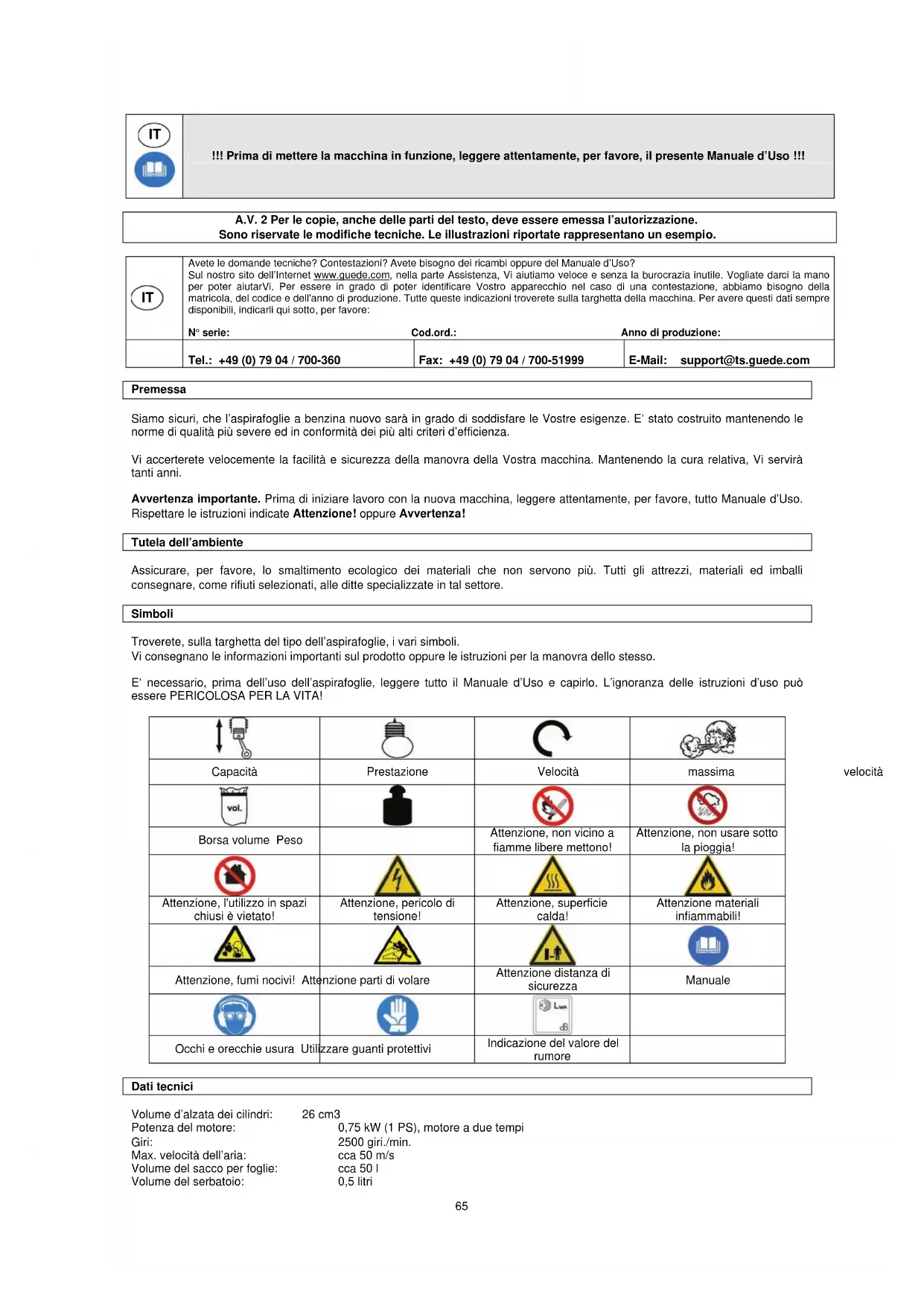 Tel.: +49 (0) 79 04 / 700-360 Fax: +49 (0) 79 04 / 700-51999 E-Mail: support@ts.guede.com Premessa Siamo sicuri, che l’aspirafoglie a benzina nuovo sarà in grado di soddisfare le Vostre esigenze. E‘ stato costruito mantenendo le norme di qualità più severe ed in conformità dei più alti criteri d’efficienza. Vi accerterete velocemente la facilità e sicurezza della manovra della Vostra macchina. Mantenendo la cura relativa, Vi servirà tanti anni. Avvertenza importante. Prima di iniziare lavoro con la nuova macchina, leggere attentamente, per favore, tutto Manuale d’Uso. Rispettare le istruzioni indicate Attenzione! oppure Avvertenza! Tutela dell’ambiente Assicurare, per favore, lo smaltimento ecologico dei materiali che non servono più. Tutti gli attrezzi, materiali ed imballi consegnare, come rifiuti selezionati, alle ditte specializzate in tal settore. Simboli Troverete, sulla targhetta del tipo dell’aspirafoglie, i vari simboli. Vi consegnano le informazioni importanti sul prodotto oppure le istruzioni per la manovra dello stesso. E‘ necessario, prima dell’uso dell’aspirafoglie, leggere tutto il Manuale d’Uso e capirlo. L’ignoranza delle istruzioni d’uso può essere PERICOLOSA PER LA VITA!