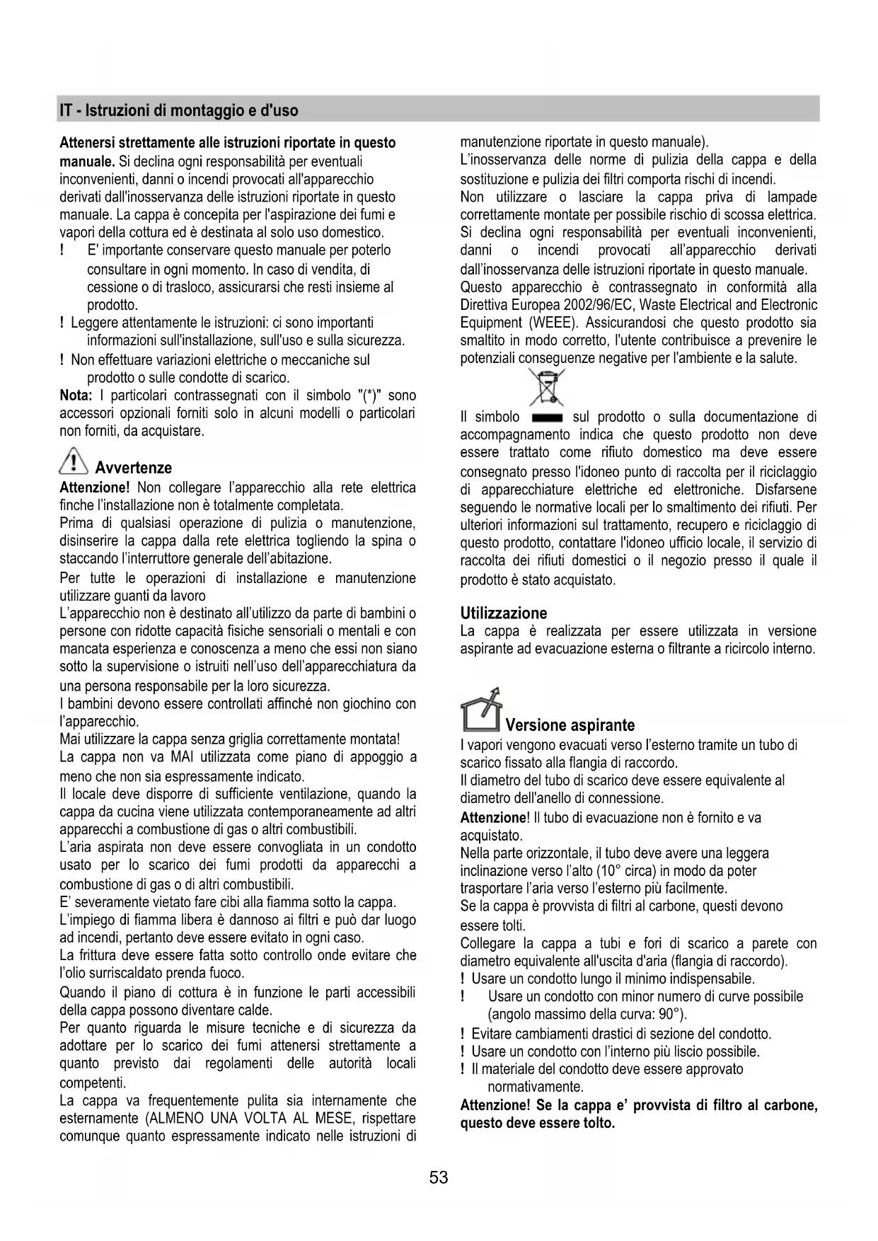 manuale. La cappa è concepita per l'aspirazione dei fumi e
