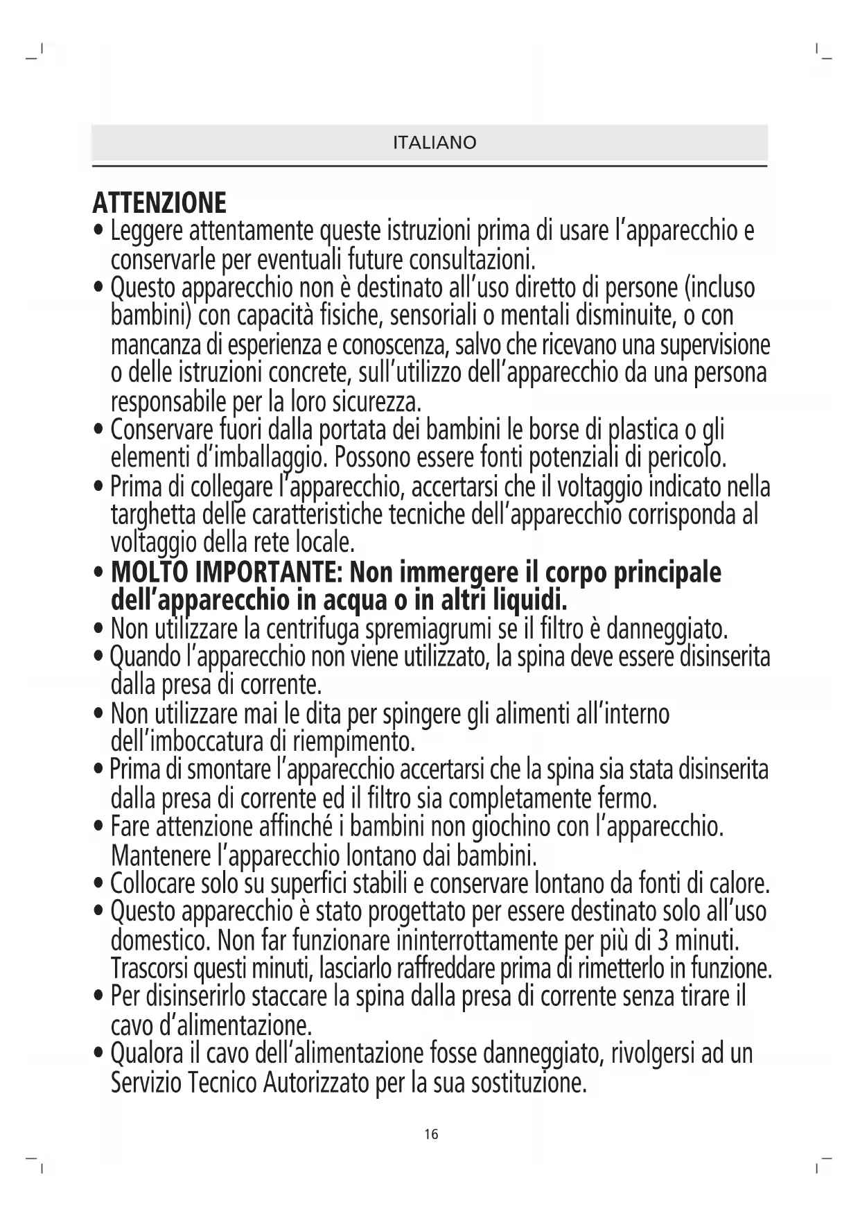- MOLTO IMPORTANTE: Non immergere il corpo principale dell’apparecchio in acqua o in altri liquidi.