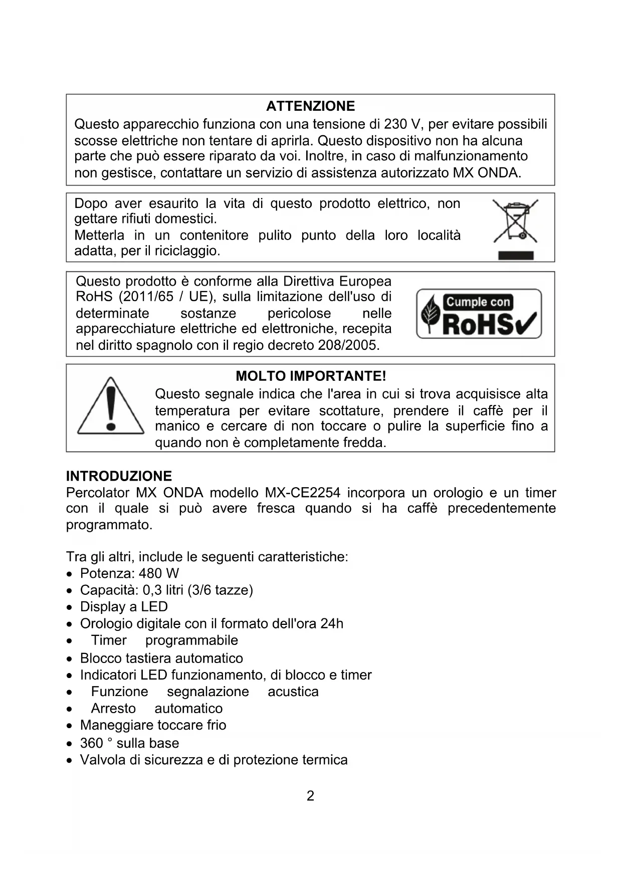 Questo prodotto è conforme alla Direttiva Europea RoHS (2011/65 / UE), sulla limitazione dell'uso di determinate sostanze pericolose nelle apparecchiature elettriche ed elettroniche, recepita nel diritto spagnolo con il regio decreto 208/2005. MOLTO IMPORTANTE! Questo segnale indica che l'area in cui si trova acquisisce alta temperatura per evitare scottature, prendere il caffè per il manico e cercare di non toccare o pulire la superficie fino a quando non è completamente fredda. INTRODUZIONE Percolator MX ONDA modello MX-CE2254 incorpora un orologio e un timer con il quale si può avere fresca quando si ha caffè precedentemente programmato. Tra gli altri, include le seguenti caratteristiche: