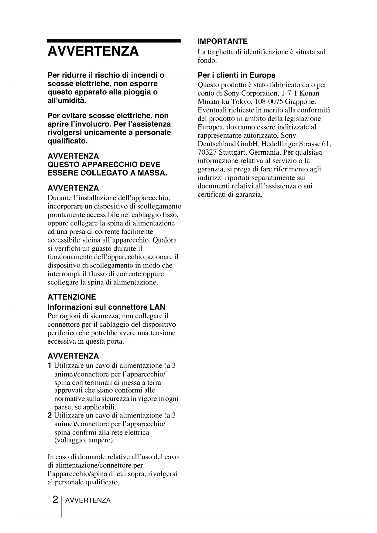 AVVERTENZA AVVERTENZA Per ridurre il rischio di incendi o
