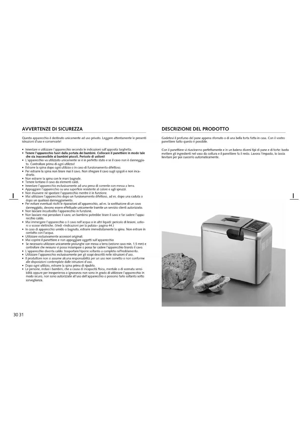 - Tenere l'apparechecchio fuori alla portata del bambi. Collocare il panettiere In modo tale che sua inaccessibile al bambini pliccoli. Pericolo di ustoni!