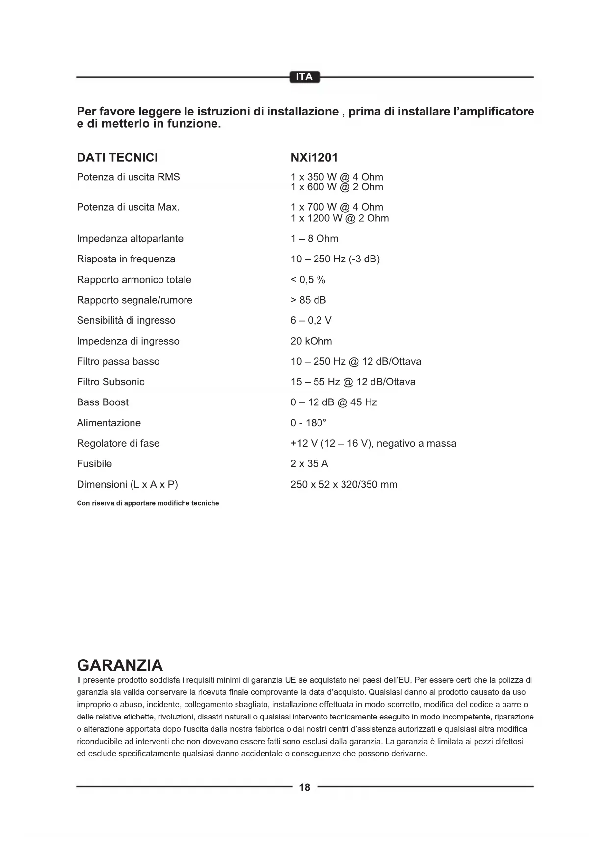 Per favore leggere le istruzioni di installazione, prima di installare l'amplificatore e di metterlo in funzione.