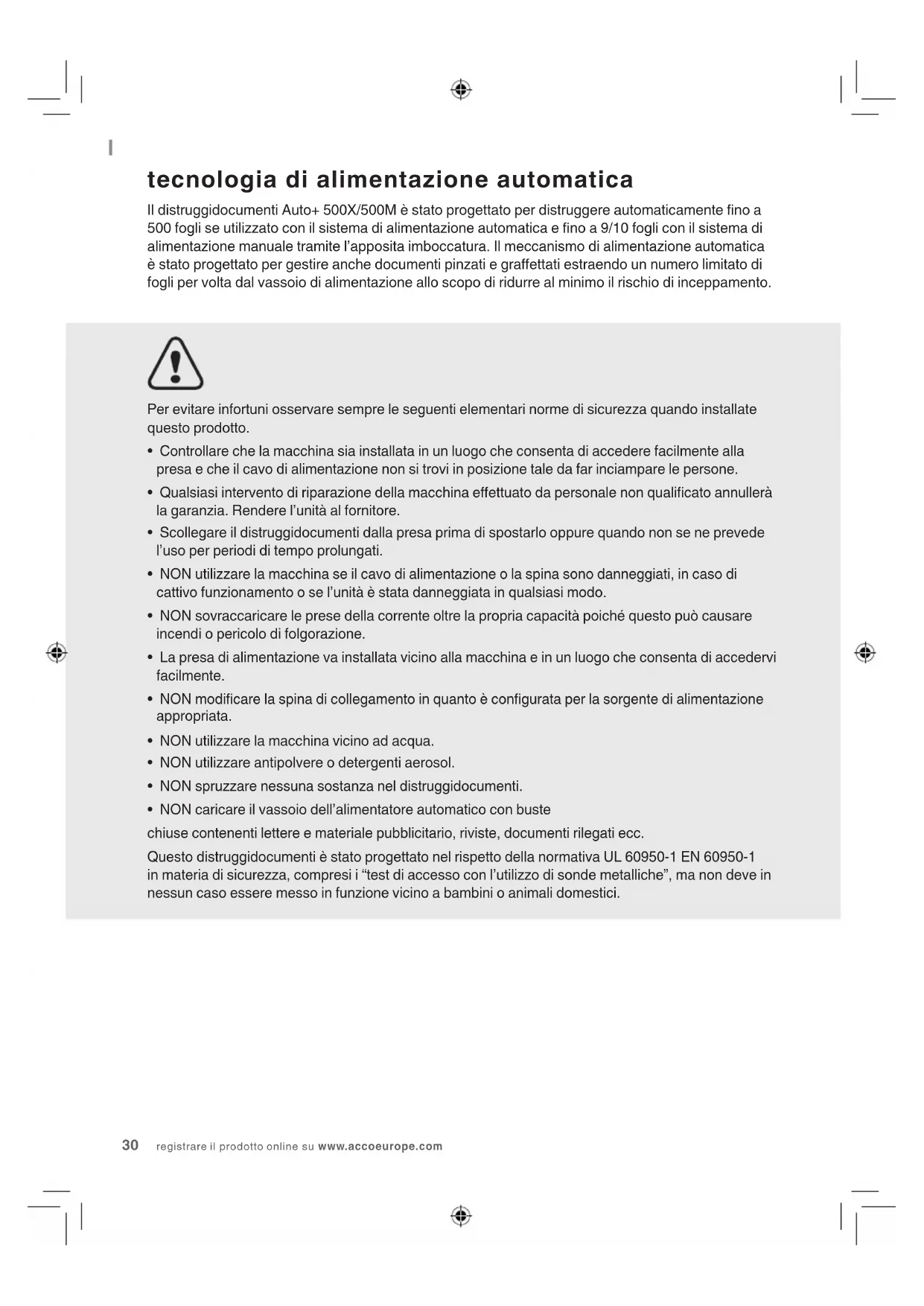 - NON caricare il vassoio dell’alimentatore automatico con buste chiuse contenenti lettere e materiale pubblicitario, riviste, documenti rilegati ecc. Questo distruggidocumenti è stato progettato nel rispetto della normativa UL 60950-1 EN 60950-1 in materia di sicurezza, compresi i “test di accesso con l’utilizzo di sonde metalliche”, ma non deve in nessun caso essere messo in funzione vicino a bambini o animali domestici. tecnologia di alimentazione automatica Il distruggidocumenti Auto+ 500X/500M è stato progettato per distruggere automaticamente no a 500 fogli se utilizzato con il sistema di alimentazione automatica e no a 9/10 fogli con il sistema di alimentazione manuale tramite l’apposita imboccatura. Il meccanismo di alimentazione automatica è stato progettato per gestire anche documenti pinzati e graettati estraendo un numero limitato di fogli per volta dal vassoio di alimentazione allo scopo di ridurre al minimo il rischio di inceppamento.AUTO+ 500X&500M DISTRUGGIDOCUMENTI 31