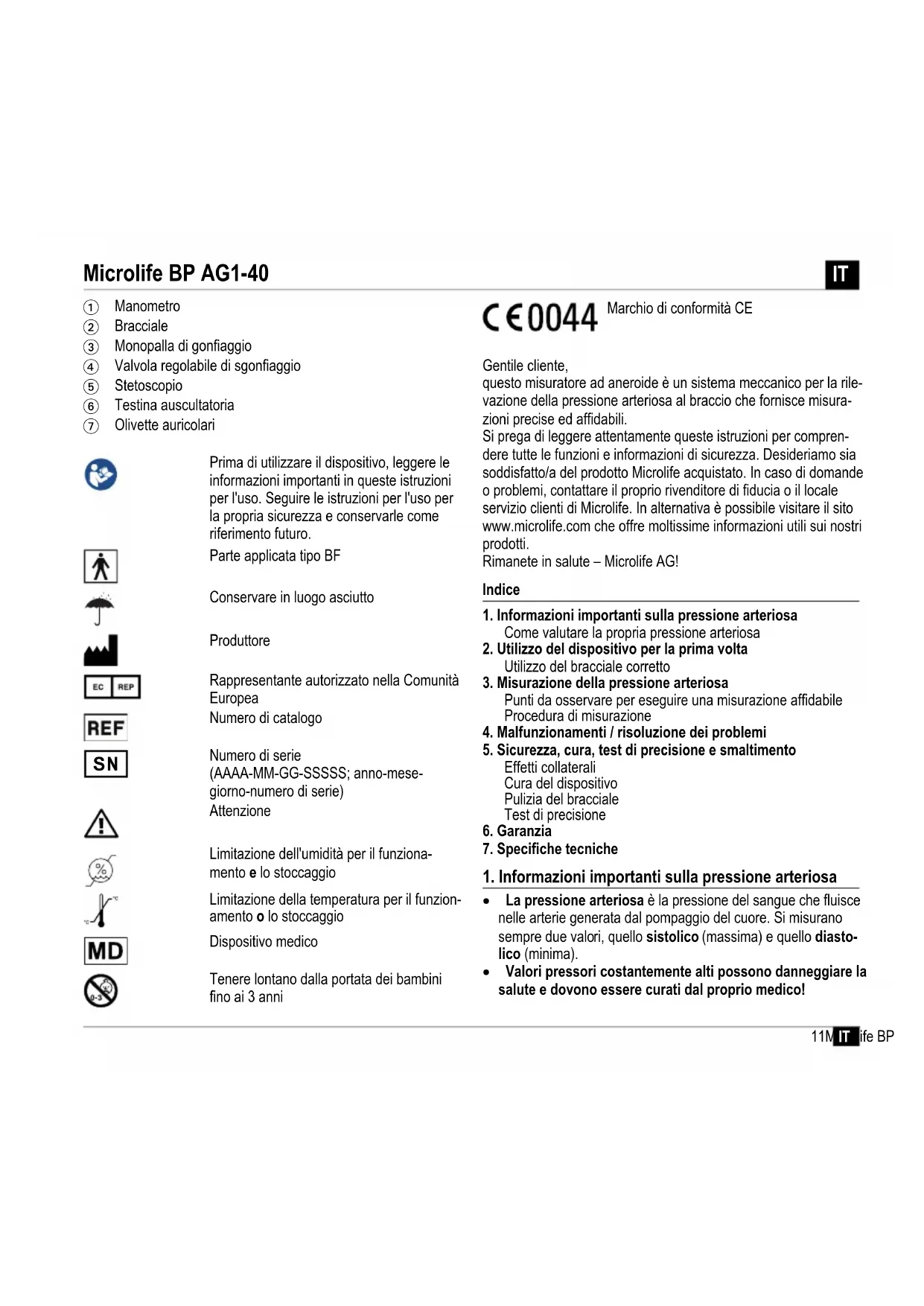 Gentile cliente, questo misuratore ad aneroide è un sistema meccanico per la rile- vazione della pressione arteriosa al braccio che fornisce misura- zioni precise ed affidabili. Si prega di leggere attentamente queste istruzioni per compren- dere tutte le funzioni e informazioni di sicurezza. Desideriamo sia soddisfatto/a del prodotto Microlife acquistato. In caso di domande o problemi, contattare il proprio rivenditore di fiducia o il locale servizio clienti di Microlife. In alternativa è possibile visitare il sito www.microlife.com che offre moltissime informazioni utili sui nostri prodotti. Rimanete in salute – Microlife AG! Indice