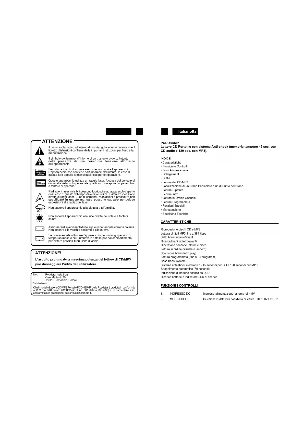 ATTENZIONE Il punto esclamativo all’interno di un triangolo avverte l’utente che il libretto d’istruzioni contiene delle importanti istruzioni per l’uso e la manutenzione. Il simbolo del fulmine all’interno di un triangolo avverte l’utente della presenza di una pericolosa tensione all’interno dell’apparecchio. Per ridurre i rischi di scosse elettriche, non aprire l’apparecchio. L’apparecchio non contiene parti riparabili dall’utente. In caso di guasto fare appello a tecnici qualificati per le riparazioni. Questo apparecchio utilizza un raggio laser. A causa del pericolo di danni alla vista, solo personale qualificato può aprire l’apparecchio o tentare di ripararlo. Radiazioni laser invisibili possono fuoriuscire ad apparecchio aperto on in caso di guasto del dispositivo di sicurezza. Evitare l’esposizione diretta ai raggi laser. L’uso di comandi, regolazioni o procedure non specificate in questo manuale possono causare pericolose esposizioni alle radiazioni laser. Non esporre l’apparecchio alla pioggia o all’umidità. Non esporre l’apparecchio alla luce diretta del sole o a fonti di calore. Assicurarsi di aver inserito tutte le pile rispettando la corretta polarità. Non inserire pile vecchie assieme a pile nuove. Se non intendete utilizzare l’apparecchio per un lungo periodo di tempo (un mese o più), rimuovere tutte le pile dal compartimento per evitare possibili fuoriuscite di acido. Noi. RoadstarItaliaSpa Viale Matteotti 39 I-22012Cernobbio(Como) CheilmodelloLettoreCD/MP3PortatilePCD-495MPdellaRoadstar èprodottoinconformità al D.M. no. 548 datato 28/08/95 (G.U. no. 301 datata 28/12/95) e, in particolare, è in conformitàalle prescrizionidell’articolo 2 comma 1. Dichiariamo: ATTENZIONE! L’ascolto prolungato a massima potenza del lettore di CD/MP3 può danneggiare l’udito dell`utilizzatore.ItalianoItaliano 39 40
