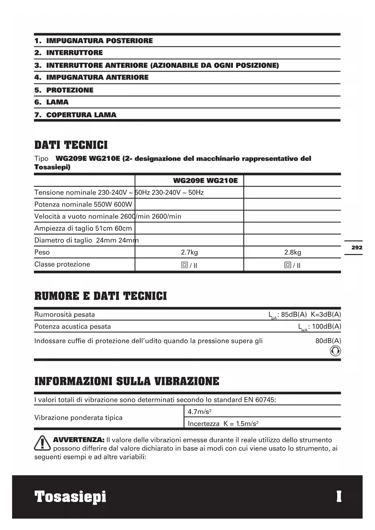 7. COPERTURA LAMA DATI TECNICI Tipo WG209E WG210E (2- designazione del macchinario rappresentativo del