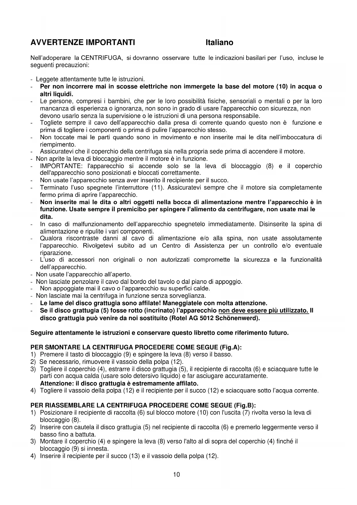 Grâce à son séparateur, la CENTRIFUGEUSE permet de récupérer la pulpe qui peut être utilisée comme base pour la préparation de sauces, soupes, marmelades, etc.... Dans ce cas faire cuire la pulpe à feu doux pendant 30 minutes environ. ATTENTION - Cet appareil est conçu exclusivement pour un usage domestique et non commercial ou industriel. - Le bloc-moteur (10) ne doit jamais être plongé dans de l’eau. - Toute réparation doit être exclusivement exécutée auprès d’un service après-vente qualifié et compétent, habilitée à faire ce genre de réparation.10 AVVERTENZE IMPORTANTI Italiano Nell’adoperare la CENTRIFUGA, si dovranno osservare tutte le indicazioni basilari per l’uso, incluse le seguenti precauzioni: - Leggete attentamente tutte le istruzioni. - Per non incorrere mai in scosse elettriche non immergete la base del motore (10) in acqua o altri liquidi. - Le persone, compresi i bambini, che per le loro possibilità fisiche, sensoriali o mentali o per la loro mancanza di esperienza o ignoranza, non sono in grado di usare l'apparecchio con sicurezza, non devono usarlo senza la supervisione o le istruzioni di una persona responsabile. - Togliete sempre il cavo dell’apparecchio dalla presa di corrente quando questo non è funzione e prima di togliere i componenti o prima di pulire l’apparecchio stesso. - Non toccate mai le parti quando sono in movimento e non inserite mai le dita nell’imboccatura di riempimento. - Assicuratevi che il coperchio della centrifuga sia nella propria sede prima di accendere il motore. - Non aprite la leva di bloccaggio mentre il motore è in funzione. - IMPORTANTE: l'apparecchio si accende solo se la leva di bloccaggio (8) e il coperchio dell'apparecchio sono posizionati e bloccati correttamente. - Non usate l’apparecchio senza aver inserito il recipiente per il succo. - Terminato l’uso spegnete l’interruttore (11). Assicuratevi sempre che il motore sia completamente fermo prima di aprire l’apparecchio. - Non inserite mai le dita o altri oggetti nella bocca di alimentazione mentre l’apparecchio è in funzione. Usate sempre il premicibo per spingere l’alimento da centrifugare, non usate mai le dita. - In caso di malfunzionamento dell’apparecchio spegnetelo immediatamente. Disinserite la spina di alimentazione e ripulite i vari componenti. - Qualora riscontraste danni al cavo di alimentazione e/o alla spina, non usate assolutamente l’apparecchio. Rivolgetevi subito ad un Centro di Assistenza per un controllo e/o eventuale riparazione. - L’uso di accessori non originali o non autorizzati compromette la sicurezza e la funzionalità dell’apparecchio. - Non usate l’apparecchio all’aperto. - Non lasciate penzolare il cavo dal bordo del tavolo o dal piano di appoggio. - Non appoggiate mai il cavo o l’apparecchio su superfici calde. - Non lasciate mai la centrifuga in funzione senza sorveglianza. - Le lame del disco grattugia sono affilate! Maneggiatele con molta attenzione. - Se il disco grattugia (5) fosse rotto (incrinato) l'apparecchio non deve essere più utilizzato. Il disco grattugia può venire da noi sostituito (Rotel AG 5012 Schönenwerd). Seguire attentamente le istruzioni e conservare questo libretto come riferimento futuro. PER SMONTARE LA CENTRIFUGA PROCEDERE COME SEGUE (Fig.A):