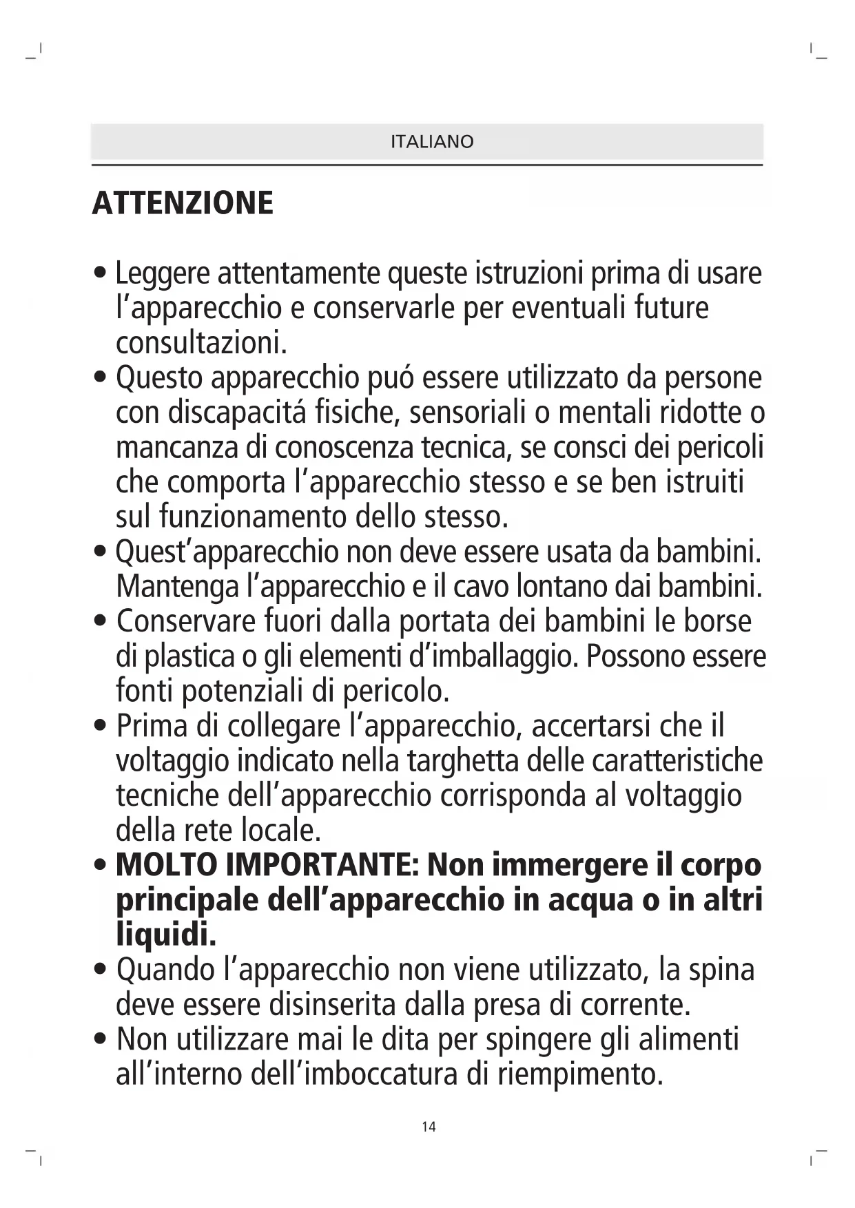 - MOLTO IMPORTANTE: Non immergere il corpo principale dell’apparecchio in acqua o in altri liquidi.