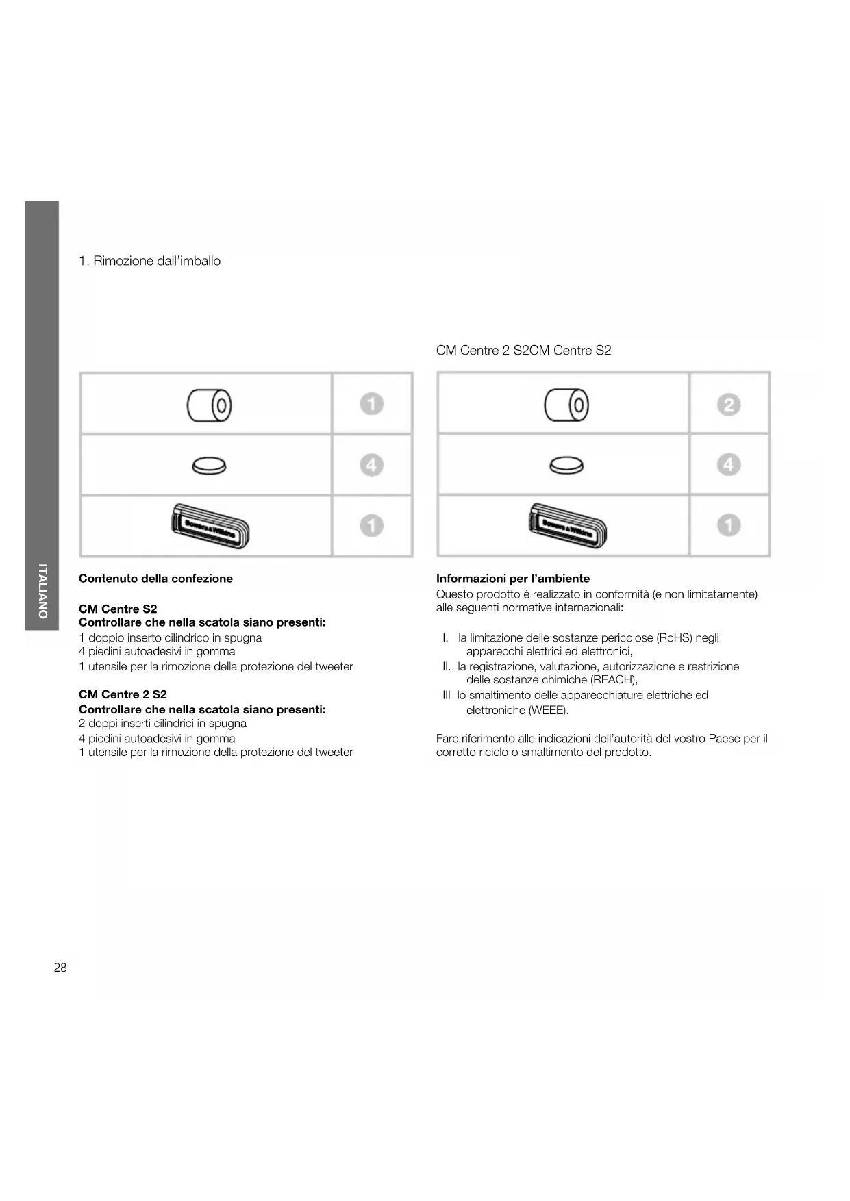 Contenuto della confezione CM Centre S2 Controllare che nella scatola siano presenti: 1 doppio inserto cilindrico in spugna 4 piedini autoadesivi in gomma 1 utensile per la rimozione della protezione del tweeter CM Centre 2 S2 Controllare che nella scatola siano presenti: 2 doppi inserti cilindrici in spugna 4 piedini autoadesivi in gomma 1 utensile per la rimozione della protezione del tweeter Informazioni per l’ambiente Questo prodotto è realizzato in conformità (e non limitatamente) alle seguenti normative internazionali: