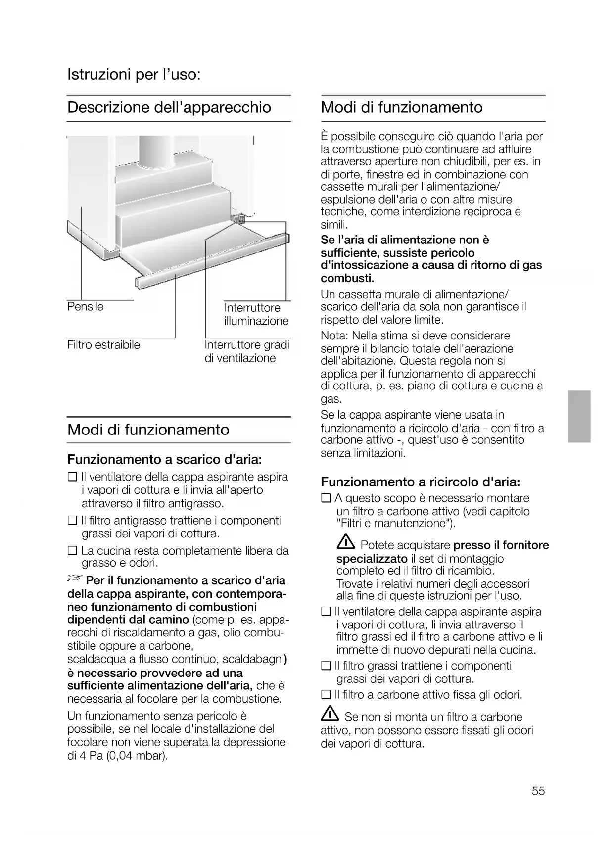 Primo impiego: ❑ Questo libretto di istruzioni per l'usoèprevisto per più versioni dell'apparecchio. É possibile che sianodescritti singoli particolari della dotazio-ne, che non riguardano il Vostro appa-recchio.❑ Questa cappa aspirante è conforme allepertinenti norme di sicurezza.Le riparazioni devono essere eseguitesolo da personale specializzato.Le riparazioni non eseguite a regola d'arte possono causare pericoli graviper l'utilizzatore. Non fiammeggiare pietanze sotto la cappa aspirante.Pericolo d'incendio del filtro grassi ! se raggiunto delle fiamme.