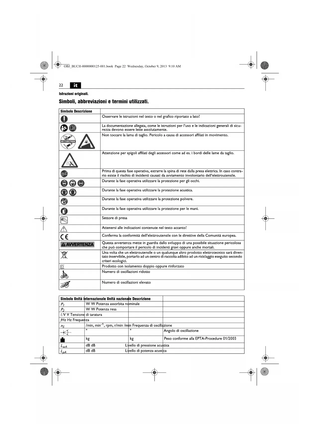 Il livello di oscillazioni indicato rappresente le applicazioni principali dell'elettroutensile. Se tuttavia l'elettrotensile viene utilizzato per altri Impieghli, con accessori differenti oppure non viene effettuata una sufficiente manutenzione è possible che il livello di oscillazioni sia differente. Questo può augmentare sensibilmente la sollecitazione da vibrazioni per l'intero periodo di lavoro.