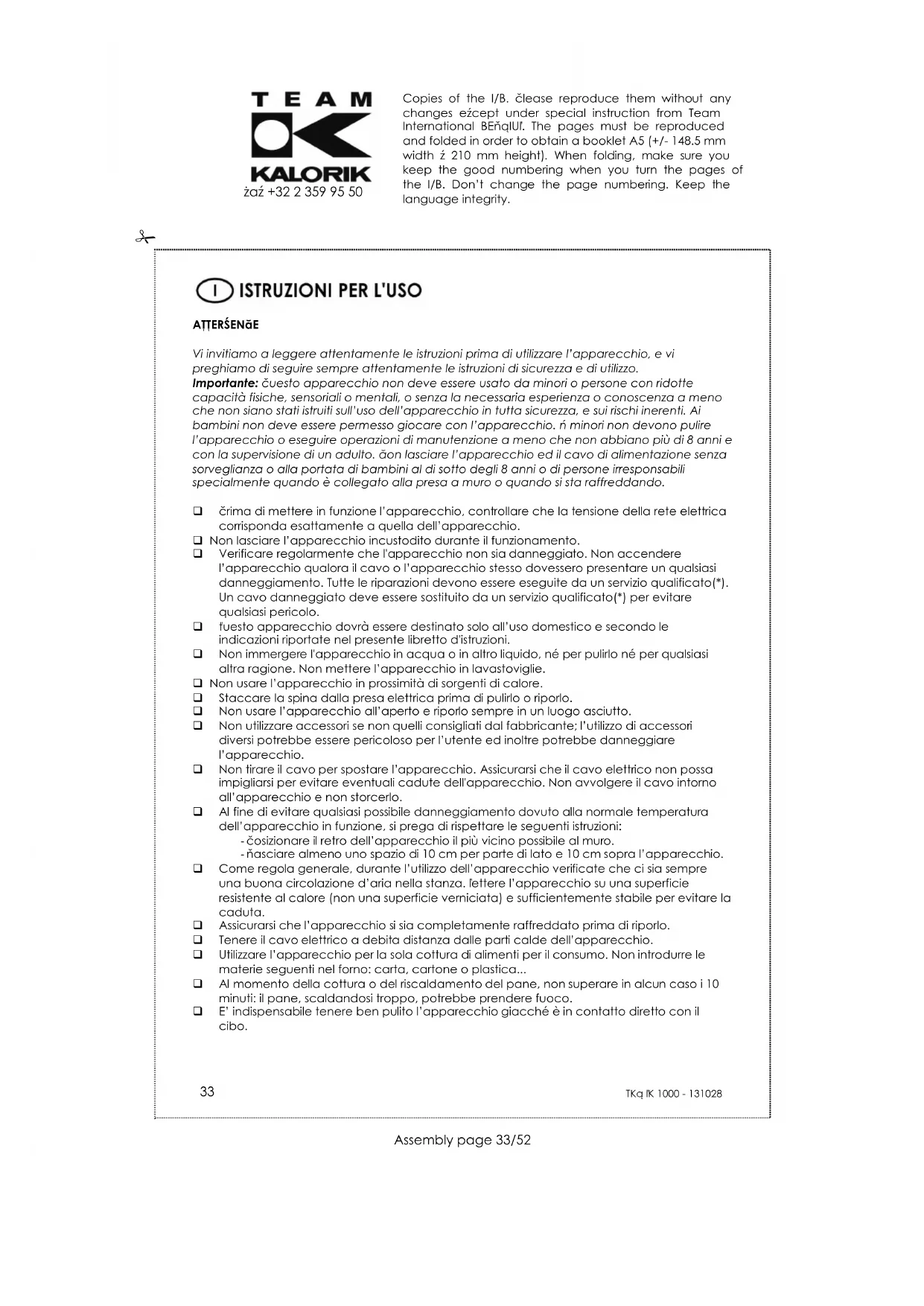 Fax +32 2 359 95 50 La temperatura delle superfici accessibili potrebbe essere molto alta durante il funzionamento dell'apparecchio. Non toccare le parti calde dell’apparecchio, in particolare la porta o il vetro. Durante il funzionamento, se è necessario spostare l’elettrodomestico, usare dei guanti da cucina. Assicurarsi che le parti calde dell’apparecchio non entrino in contatto con materiali facilmente infiammabili come tende, tovaglie...poiché durante il funzionamento potrebbero incendiarsi. Stare attento che l’elemento riscaldante non entri in contatto con alcun oggetto. Togliere la spina dalla presa di corrente quando l’apparecchio non è in funzione, soprattutto se non è presente un interruttore generale ON/OFF. Si consiglia di posizionare l’elettrodomestico su un piano termoresistente o utilizzare un rivestimento termoresistente da interporre tra l’apparecchio e il piano di appoggio per non lasciare segni, causati dal calore, sul piano stesso. I preparati composti con olio o grassi possono prendere fuoco se troppo surriscaldati. Bisogna quindi essere molto prudente. Se si usa l’apparecchio al di sotto di una cappa, rispettare la distanza minima consigliata dal fabbricante di quell’ultima. In quanto riguarda il punto precedente, bisogna raddoppiare la prudenza. Staccare immediatamente la spina dalla presa di corrente se dovesse comparire una fessura e rivolgersi ad un centro assistenza qualificato(*). L’apparecchio non deve mai essere acceso tramite un timer esterno o un altro sistema di comando a distanza separato. Nota bene: Quando questo simbolo è apposto su una superficie particolare, accentua la messa in guardia e significa: ATTENZIONE, questa superficie può diventare calda durante l'uso. Il simbolo è sempre apposto su quelle superfici con temperatura più alta, anche se le altre superfici di metallo oppure non metallo potrebbero comunque diventare altrettanto calde durante l’utilizzo per cui è consigliabile maneggiare sempre con cura e, se possibile, con l'aiuto di guanti isotermici o altre protezioni termiche l’apparecchio. Nel caso in cui vi sia incertezza sulla temperatura della superficie proteggere sempre le mani con un guanto da forno. (*) Servizio assistenza qualificato: servizio assistenza tecnica del fabbricante o dell’importatore o una persona qualificata, riconosciuta ed autorizzata ad effettuare riparazioni. Rivolgere in ogni caso l’apparecchio a questo servizio. ISTRUZIONI PER L’USO DI UN CAVO CORTO Il cavo di alimentazione è di tipo corto per ridurre i rischi dovuti alla possibilità che si impigli o crei impicci. Se si rende necessario l’uso di prolunghe, verificare quanto segue: