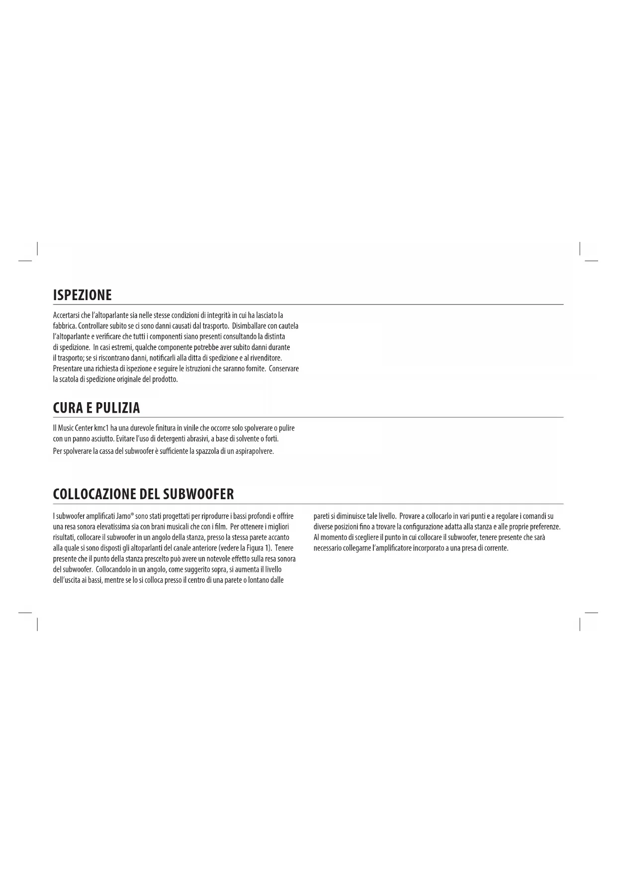 I subwoofer amplicati Jamo® sono stati progettati per riprodurre i bassi profondi e orire una resa sonora elevatissima sia con brani musicali che con i lm. Per ottenere i migliori risultati, collocare il subwoofer in un angolo della stanza, presso la stessa parete accanto alla quale si sono disposti gli altoparlanti del canale anteriore (vedere la Figura 1). Tenere presente che il punto della stanza prescelto può avere un notevole eetto sulla resa sonora del subwoofer. Collocandolo in un angolo, come suggerito sopra, si aumenta il livello dell’uscita ai bassi, mentre se lo si colloca presso il centro di una parete o lontano dalle pareti si diminuisce tale livello. Provare a collocarlo in vari punti e a regolare i comandi su diverse posizioni no a trovare la congurazione adatta alla stanza e alle proprie preferenze. Al momento di scegliere il punto in cui collocare il subwoofer, tenere presente che sarà necessario collegarne l’amplicatore incorporato a una presa di corrente. Accertarsi che l’altoparlante sia nelle stesse condizioni di integrità in cui ha lasciato la fabbrica. Controllare subito se ci sono danni causati dal trasporto. Disimballare con cautela l’altoparlante e vericare che tutti i componenti siano presenti consultando la distinta di spedizione. In casi estremi, qualche componente potrebbe aver subito danni durante il trasporto; se si riscontrano danni, noticarli alla ditta di spedizione e al rivenditore. Presentare una richiesta di ispezione e seguire le istruzioni che saranno fornite. Conservare la scatola di spedizione originale del prodotto. ISPEZIONE Il Music Center kmc1 ha una durevole nitura in vinile che occorre solo spolverare o pulire con un panno asciutto. Evitare l’uso di detergenti abrasivi, a base di solvente o forti. Per spolverare la cassa del subwoofer è suciente la spazzola di un aspirapolvere.