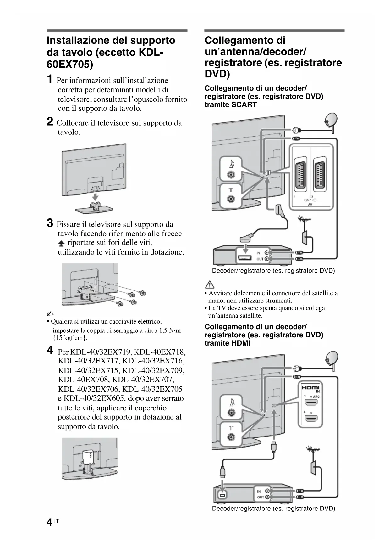 e KDL-40/32EX605, dopo aver serrato tutte le viti, applicare il coperchio posteriore del supporto in dotazione al supporto da tavolo. Collegamento di un’antenna/decoder/ registratore (es. registratore DVD) Collegamento di un decoder/ registratore (es. registratore DVD) tramite SCART