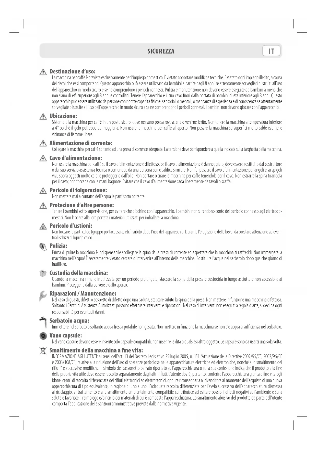 Destinazione d’uso: La macchina per caffè è prevista esclusivamente per l’impiego domestico. È vietato apportare modifiche tecniche. È vietato ogni impiego illecito, a causa dei rischi che essi comportano! Questo apparecchio può essere utilizzato da bambini a partire dagli 8 anni se attentamente sorvegliati o istruiti all’uso dell’apparecchio in modo sicuro e se ne comprendono i pericoli connessi. Pulizia e manutenzione non devono essere eseguite da bambini a meno che non siano di età superiore agli 8 anni e controllati. Tenere l’apparecchio e il suo cavo fuori dalla portata di bambini di età inferiore agli 8 anni. Questo apparecchio può essere utilizzato da persone con ridotte capacità fisiche, sensoriali o mentali, o mancanza di esperienza e di conoscenza se attentamente sorvegliate o istruite all’uso dell’apparecchio in modo sicuro e se ne comprendono i pericoli connessi. I bambini non devono giocare con l’apparecchio. Ubicazione: Sistemare la macchina per caffè in un posto sicuro, dove nessuno possa rovesciarla o venirne ferito. Non tenere la macchina a temperatura inferiore a 4° poiché il gelo potrebbe danneggiarla. Non usare la macchina per caffè all’aperto. Non posare la macchina su superfici molto calde e/o nelle vicinanze di fiamme libere. Alimentazione di corrente: Collegare la macchina per caffè soltanto ad una presa di corrente adeguata. La tensione deve corrispondere a quella indicata sulla targhetta della macchina. Cavo d’alimentazione: Non usare la macchina per caffè se il cavo d’alimentazione è difettoso. Se il cavo d’alimentazione è danneggiato, deve essere sostituito dal costruttore o dal suo servizio assistenza tecnica o comunque da una persona con qualifica similare. Non far passare il cavo d’alimentazione per angoli e su spigoli vivi, sopra oggetti molto caldi e proteggerlo dall’olio. Non portare o tirare la macchina per caffè tenendola per il cavo. Non estrarre la spina tirandola per il cavo; non toccarla con le mani bagnate. Evitare che il cavo d’alimentazione cada liberamente da tavoli o scaffali. Pericolo di folgorazione: Non mettere mai a contatto dell’acqua le parti sotto corrente. Protezione d’altre persone: Tenere i bambini sotto supervisione, per evitare che giochino con l’apparecchio. I bambini non si rendono conto del pericolo connesso agli elettrodo- mestici. Non lasciare alla loro portata i materiali utilizzati per imballare la macchina. Pericolo d’ustioni: Non toccare le parti calde (gruppo portacapsula, etc.) subito dopo l’uso dell’apparecchio. Durante l’erogazione della bevanda prestare attenzione ad even- tuali schizzi di liquido caldo. Pulizia: Prima di pulire la macchina è indispensabile scollegare la spina dalla presa di corrente ed aspettare che la macchina si raffreddi. Non immergere la macchina nell’acqua! È severamente vietato cercare d’intervenire all’interno della macchina. Sostituire l’acqua nel serbatoio dopo qualche giorno di inutilizzo. Custodia della macchina: Quando la macchina rimane inutilizzata per un periodo prolungato, staccare la spina dalla presa e custodirla in luogo asciutto e non accessibile ai bambini. Proteggerla dalla polvere e dallo sporco. Riparazioni / Manutenzione: Nel caso di guasti, difetti o sospetto di difetto dopo una caduta, staccare subito la spina dalla presa. Non mettere in funzione una macchina difettosa. Soltanto i Centri di Assistenza Autorizzati possono effettuare interventi e riparazioni. Nel caso di interventi non eseguiti a regola d’arte, si declina ogni responsabilità per eventuali danni. Serbatoio acqua: Immettere nel serbatoio soltanto acqua fresca potabile non gasata. Non mettere in funzione la macchina se non c’è acqua a sufficienza nel serbatoio. Vano capsule: Nel vano capsule devono essere inserite solo capsule compatibili; non inserire le dita o qualsiasi altro oggetto. Le capsule sono da usarsi una sola volta. Smaltimento della macchina a fine vita: INFORMAZIONE AGLI UTENTI: ai sensi dell’art. 13 del Decreto Legislativo 25 luglio 2005, n. 151 “Attuazione delle Direttive 2002/95/CE, 2002/96/CE e 2003/108/CE, relative alla riduzione dell’uso di sostanze pericolose nelle apparecchiature elettriche ed elettroniche, nonché allo smaltimento dei rifiuti” e successive modifiche. Il simbolo del cassonetto barrato riportato sull’apparecchiatura o sulla sua confezione indica che il prodotto alla fine della propria vita utile deve essere raccolto separatamente dagli altri rifiuti. L’utente dovrà, pertanto, conferire l’apparecchiatura giunta a fine vita agli idonei centri di raccolta differenziata dei rifiuti elettronici ed elettrotecnici, oppure riconsegnarla al rivenditore al momento dell’acquisto di una nuova apparecchiatura di tipo equivalente, in ragione di uno a uno. L’adeguata raccolta differenziata per l’avvio successivo dell’apparecchiatura dismessa al riciclaggio, al trattamento e allo smaltimento ambientalmente compatibile contribuisce ad evitare possibili effetti negativi sull’ambiente e sulla salute e favorisce il reimpiego e/o riciclo dei materiali di cui è composta l’apparecchiatura. Lo smaltimento abusivo del prodotto da parte dell’utente comporta l’applicazione delle sanzioni amministrative previste dalla normativa vigente.COMPONENTI MACCHINA
