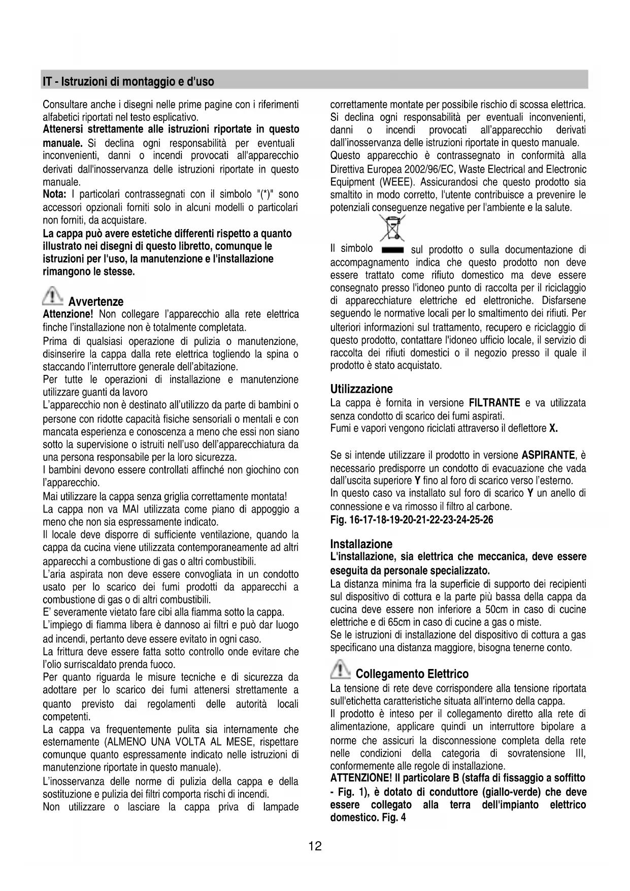 La cappa è fornita in versione FILTRANTE e va utilizzata