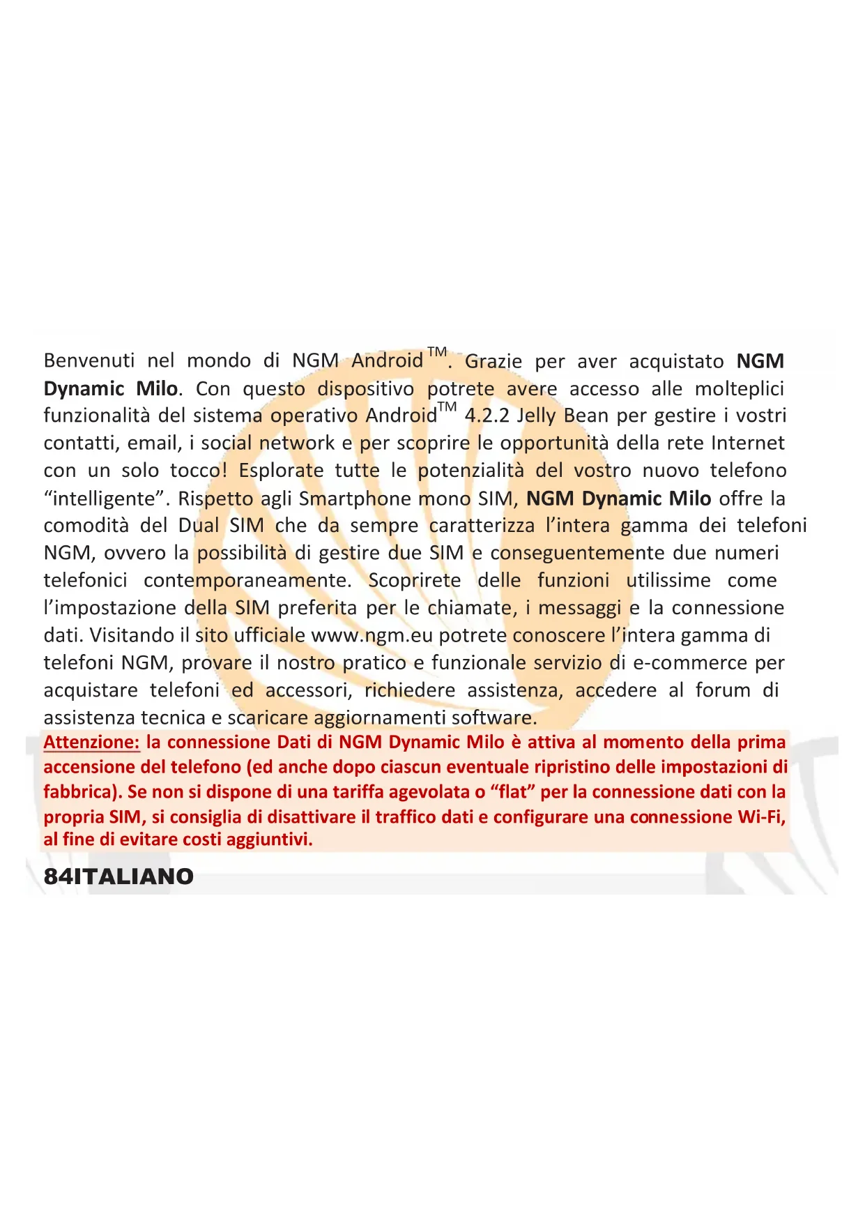 Note: è possibile utilizzare come suonerie dei file nei formati *mid,*wav,*ogg o *mp3.95ITALIANO Inviare e leggere SMS e MMS Leggere SMS e MMS: quando ricevete un nuovo SMS o MMS, viene visualizzata una icona nel pannello di notifica. Cliccando sull’icona visualizzata, è possibile accedere direttamente alla conversazione e leggere il messaggio in arrivo. In ogni caso, è possibile visualizzare i messaggi in arrivo dallo schermo principale o dal menu, selezionando Messaggi. Inviare SMS e MMS Dalla pagina o menu principale, scegliete Messaggi e quindi l’icona in basso. Digitate le prime lettere di un nome nel campo destinatario per ricercare un contatto e selezionarlo dall’elenco pop-up oppure inserite direttamente il numero del destinatario, altrimenti selezionate l’icona accanto al campo e spuntate il/i destinatari. Inserite il testo nell’apposito spazio con la tastiera virtuale. Selezionate l’icona verde “+” per includere eventuali allegati multimediali (il messaggio sarà convertito in MMS) e premete scegliendo la SIM desiderata. CONNETTIVITÀ: per utilizzare al meglio le potenzialità offerte dal terminale e dal suo sistema operativo, è necessario avere una connessione dati attiva; la connessione Dati di NGM Dynamic Milo è attiva al momento della prima accensione del telefono. Se non previsto in abbonamento, il traffico dati implica dei costi; si consiglia quindi di configurare l’accesso Internet tramite WiFi. Per abilitare il traffico dati su una delle SIM, selezionate Impostazioni > Gestione SIM > Connessione dati, o attivarla con il pulsante di impostazione rapida nel pannello di notifiche.96 ITALIANO Connettersi a Internet con la funzione Wi-Fi®: potete collegarvi alla rete WLAN utilizzando la funzione Wi-Fi. Per attivarla, dal menu principale scegliere Impostazioni > WiFi. Attenetevi a tutte le avvertenze e le indicazioni specificate dal personale autorizzato quando vi trovate in aree in cui l’uso dei dispositivi wireless è limitato (aeroplani, ospedali ecc.). Passate alla Modalità offline quando dovete utilizzare solo i servizi che non richiedono l’accesso alla rete. Connettersi a un dispositivo Bluetooth®: accendere il dispositivo Bluetooth al quale si desidera collegarsi. Riferirsi alla documentazione del dispositivo. Dal menu principale, scegliere Impostazioni > Bluetooth on/off per attivare il Bluetooth. Nel menu contestuale trovate ulteriori funzioni ed impostazioni. Scegliere Cerca dispositivi per avviare automaticamente la ricerca di dispositivi Bluetooth Tra i dispositivi rilevati, selezionare il nome del dispositivo da associare. Il telefono tenterà di associarsi al dispositivo, eventualmente verrà richiesto un codice di associazione. Connettersi a Internet: dal menu principale, scegliere Browser. Digitare l’URL nella barra degli indirizzi per avviare la navigazione. Se si sceglie di navigare con la connessione dati della rete telefonica, informarsi sui costi o scegliere un contratto dati “flat” con il proprio operatore. In alternativa, utilizzare la connessione WiFi (vedi paragrafo “Connettività”).97ITALIANO Configurazione account: per sfruttare al meglio le funzionalità del sistema Android
