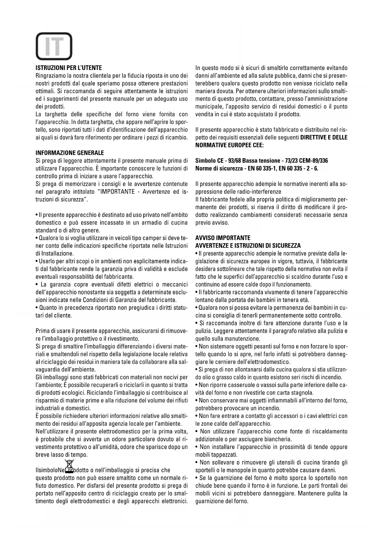 Norme di sicurezza - EN 60 335-1, EN 60 335 - 2 - 6.