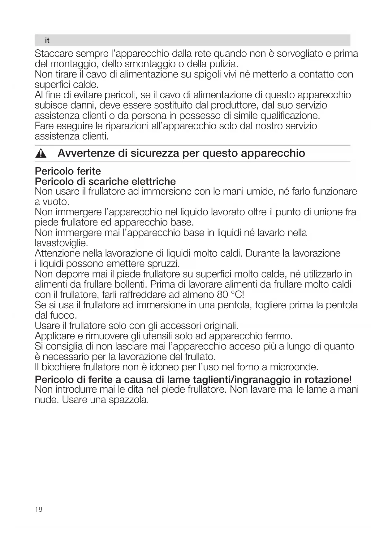 Non usare il frullatore ad immersione con le mani umide, né farlo funzionare