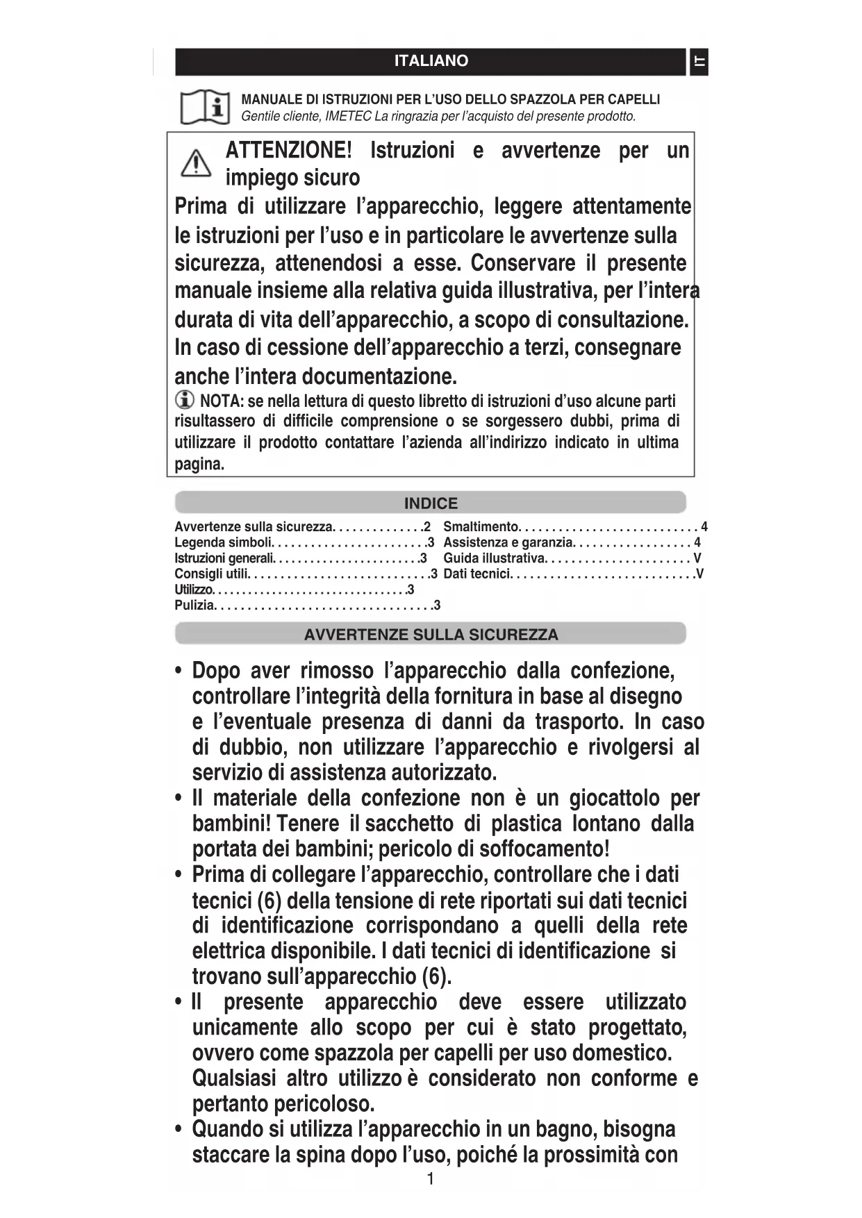 ENGLISH HAIR BRUSH INSTRUCTIONSFOR USE Dear customer, IMETEC thanks you for having purchased this product.