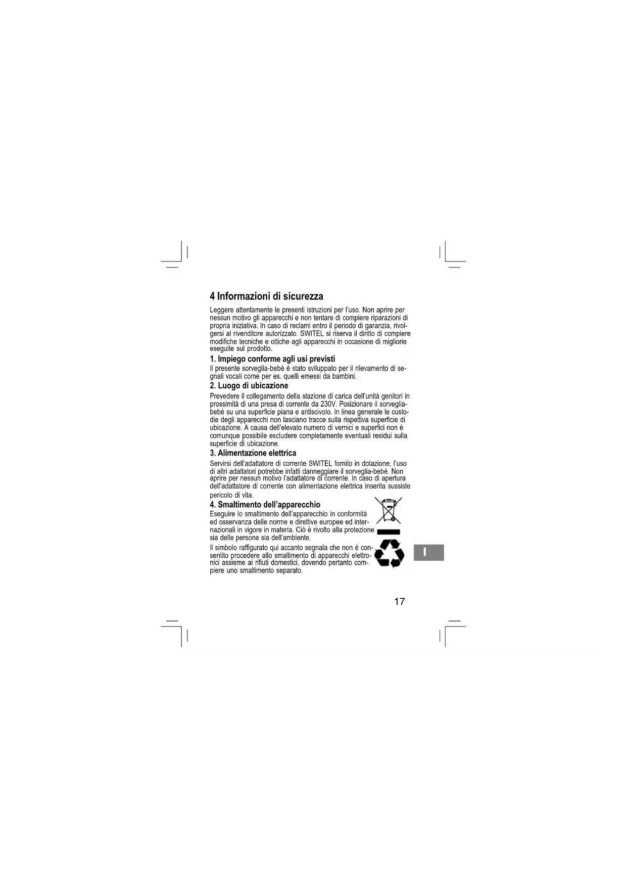 Leggere attentamente le presenti istruzioni per l'uso. Non aprire per nessun motivo gli apparecchi e non tentare di compiere riparazioni di propria iniziativa. In caso di reclami entro il periodo di garanzia, rivolgersi al rivenditore autorizzato. SWITEL si riserva il diritto di compiere modifiche tecniche e otticheagli apparecchi in occasione di migliorie eseguite sul prodotto.
