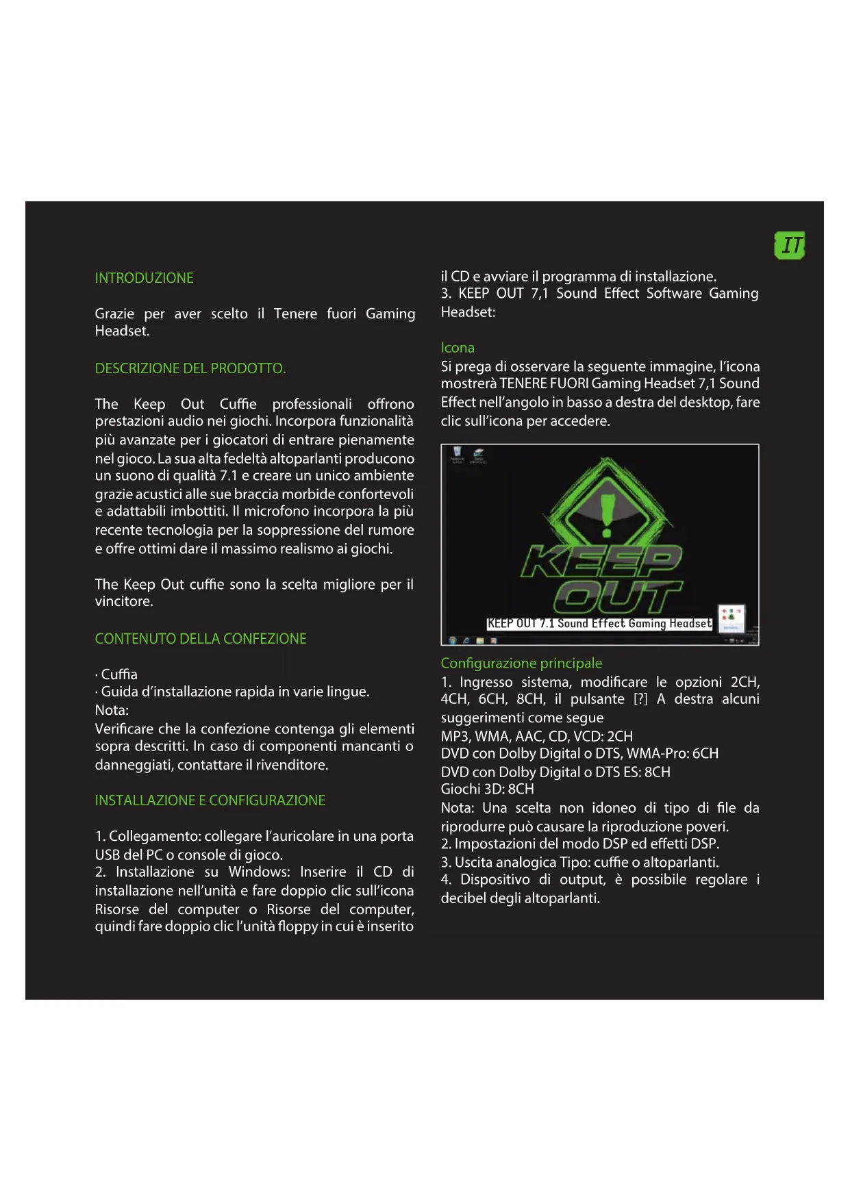 Headset: Icona Si prega di osservare la seguente immagine, l’icona mostrerà TENERE FUORI Gaming Headset 7,1 Sound Eect nell’angolo in basso a destra del desktop, fare clic sull’icona per accedere. KEEP OUT 7.1 Sound Effect Gaming Headset Congurazione principale