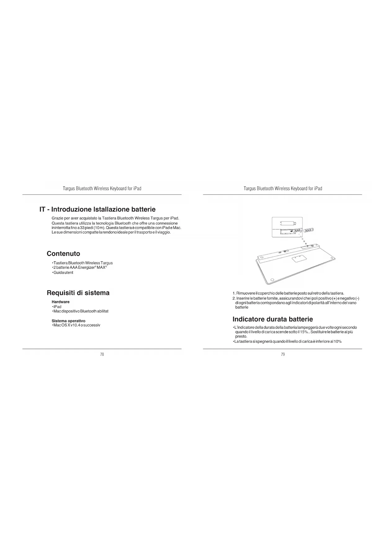 IT - Introduzione Istallazione batterie Indicatore durata batterie Contenuto Requisiti di sistema Grazie per aver acquistato la Tastiera Bluetooth Wireless Targus per iPad. Questa tastiera utilizza la tecnologia Bluetooth che offre una connessione ininterrotta no a 33 piedi (10 m). Questa tastiera è compatibile con iPad e Mac. Le sue dimensioni compatte la rendono ideale per il trasporto e il viaggio.