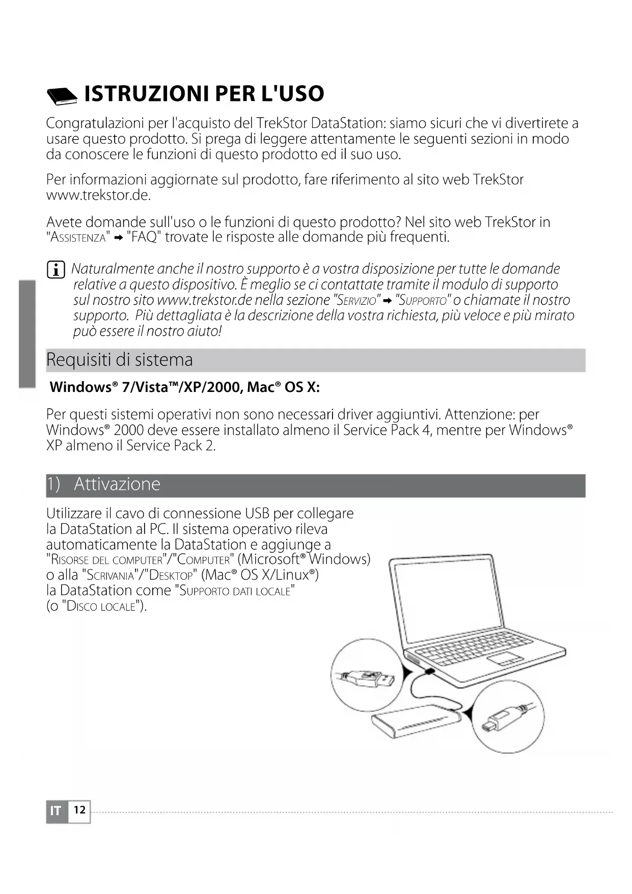 Naturalmente anche il nostro supporto è a vostra disposizione per tutte le domande relative a questo dispositivo. È meglio se ci contattate tramite il modulo di supporto sul nostro sito www.trekstor.de nella sezione "Servizio" + "Supporto" o chiamate il nostro supporto. Più dettagliata è la descrizione della vostra richiesta, più veloce e più mirato può essere il nostro aiuto! Requisiti di sistema Windows® 7/Vista™/XP/2000, Mac® OS X: Per questi sistemi operativi non sono necessari driver aggiuntivi. Attenzione: per Windows® 2000 deve essere installato almeno il Service Pack 4, mentre per Windows® XP almeno il Service Pack 2.