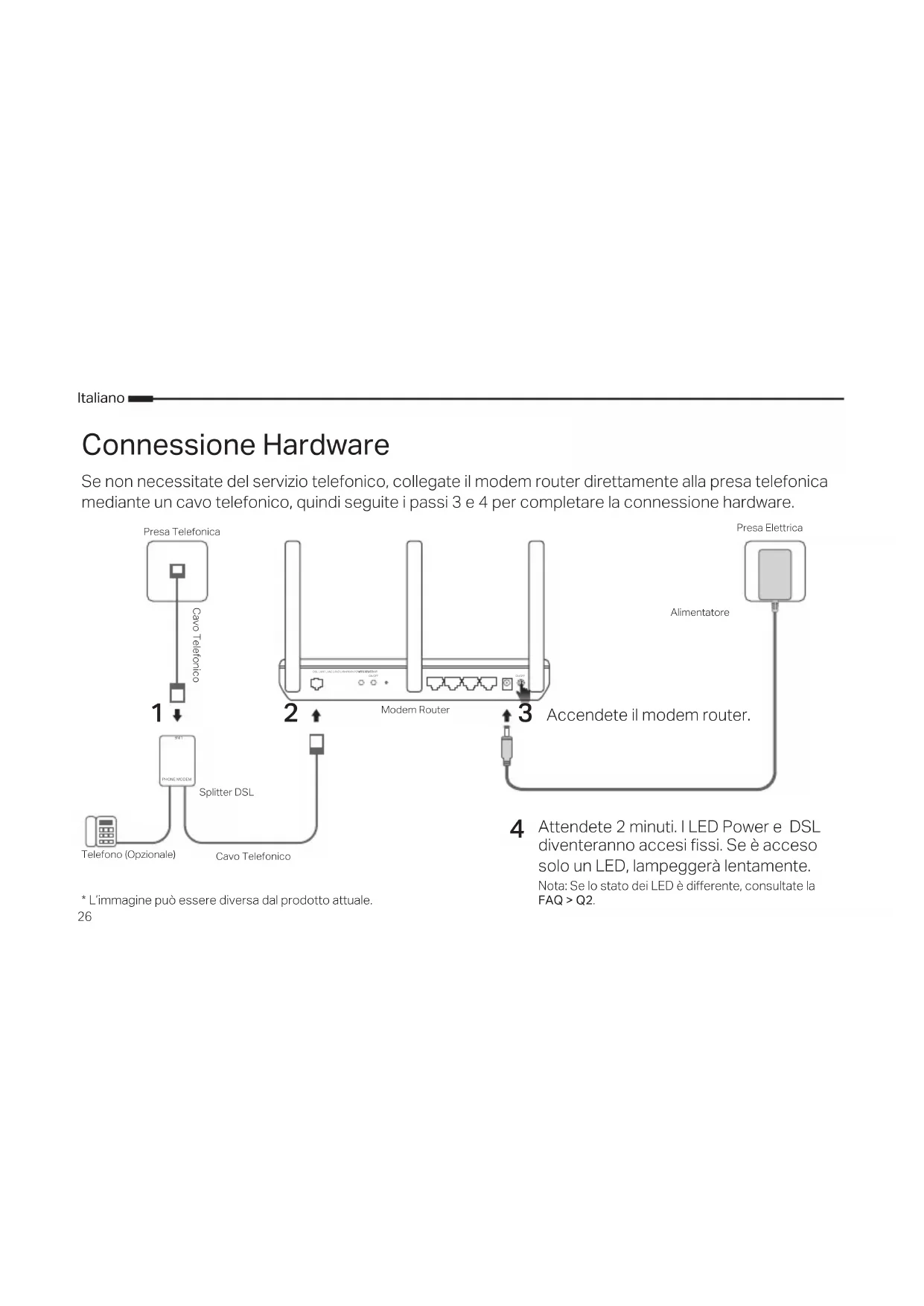 1 2 DSL LAN1 LAN2 LAN3 LAN4/WAN POWER POWERON/OFFWPS RESETWiFiON/OFF* L’immagine può essere diversa dal prodotto attuale.Nota: Se lo stato dei LED è dierente, consultate la FAQ > Q2. Attendete 2 minuti. I LED Power e DSL