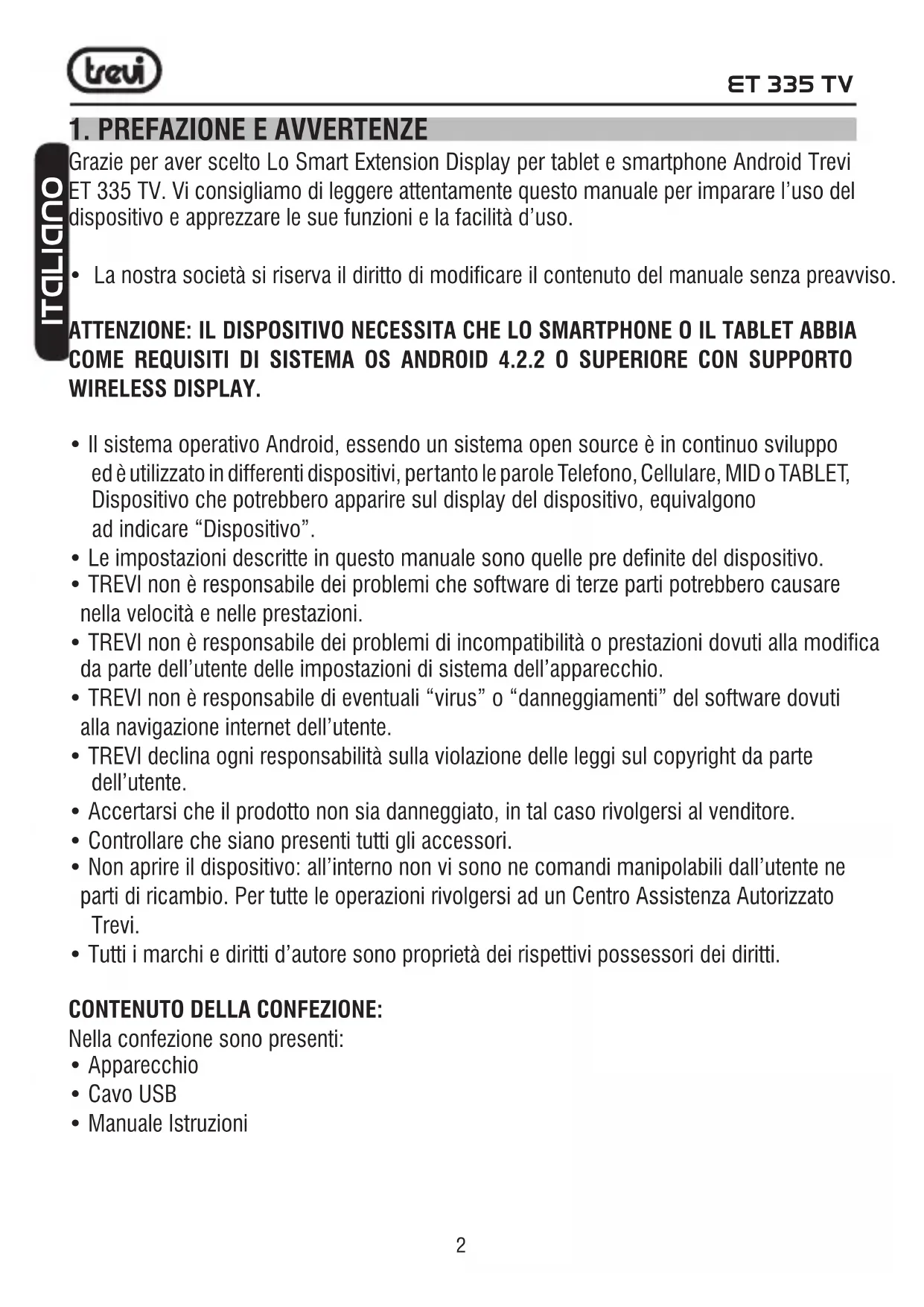 Grazie per aver scelto Lo Smart Extension Display per tablet e smartphone Android Trevi ET 335 TV. Vi consigliamo di leggere attendamente quello manuale per imparare l'uso del disposativo e apprezze le sue funzioni e lafacility d'uso.