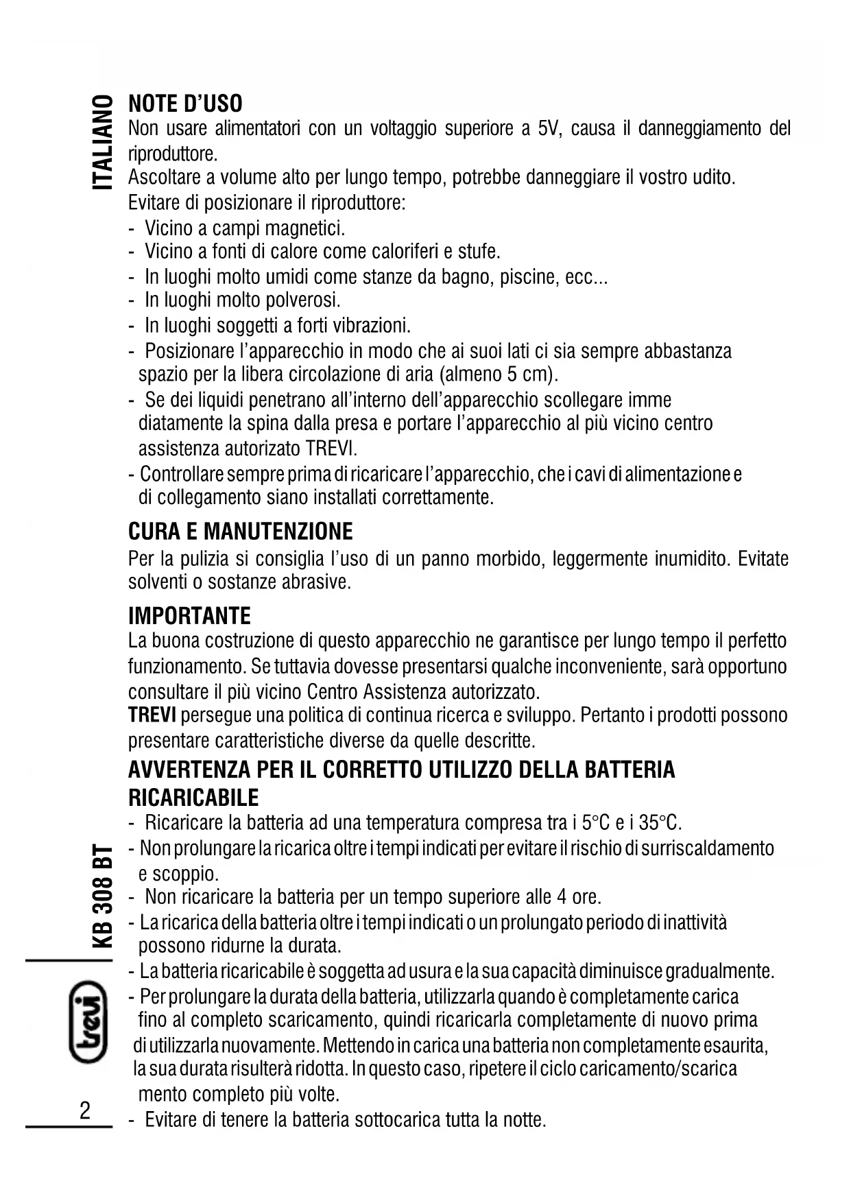 Per la pulizia si consiglia l’uso di un panno morbido, leggermente inumidito. Evitate solventi o sostanze abrasive. IMPORTANTE La buona costruzione di questo apparecchio ne garantisce per lungo tempo il perfetto funzionamento. Se tuttavia dovesse presentarsi qualche inconveniente, sarà opportuno consultare il più vicino Centro Assistenza autorizzato. TREVI persegue una politica di continua ricerca e sviluppo. Pertanto i prodotti possono presentare caratteristiche diverse da quelle descritte. AVVERTENZA PER IL CORRETTO UTILIZZO DELLA BATTERIA RICARICABILE - Ricaricare la batteria ad una temperatura compresa tra i 5°C e i 35°C. - Non prolungare la ricarica oltre i tempi indicati per evitare il rischio di surriscaldamento e scoppio. - Non ricaricare la batteria per un tempo superiore alle 4 ore. - La ricarica della batteria oltre i tempi indicati o un prolungato periodo di inattività possono ridurne la durata. - La batteria ricaricabile è soggetta ad usura e la sua capacità diminuisce gradualmente. - Per prolungare la durata della batteria, utilizzarla quando è completamente carica fino al completo scaricamento, quindi ricaricarla completamente di nuovo prima di utilizzarla nuovamente. Mettendo in carica una batteria non completamente esaurita, la sua durata risulterà ridotta. In questo caso, ripetere il ciclo caricamento/scarica mento completo più volte. - Evitare di tenere la batteria sottocarica tutta la notte.KB 308 BT