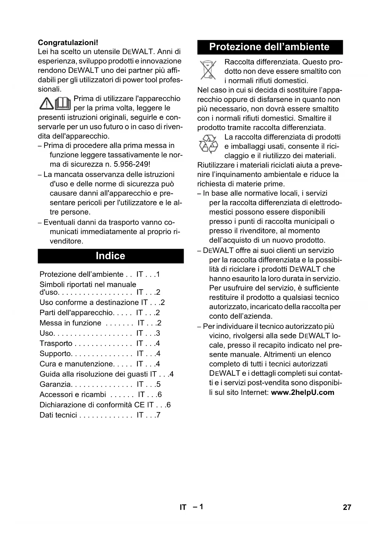 Scarica le istruzioni per il tuo Aspirapolvere in formato PDF gratuitamente! Trova il tuo manuale D27902 - DEWALT e riprendi in mano il tuo dispositivo elettronico. In questa pagina sono pubblicati tutti i documenti necessari per l'utilizzo del tuo dispositivo. D27902 del marchio DEWALT.