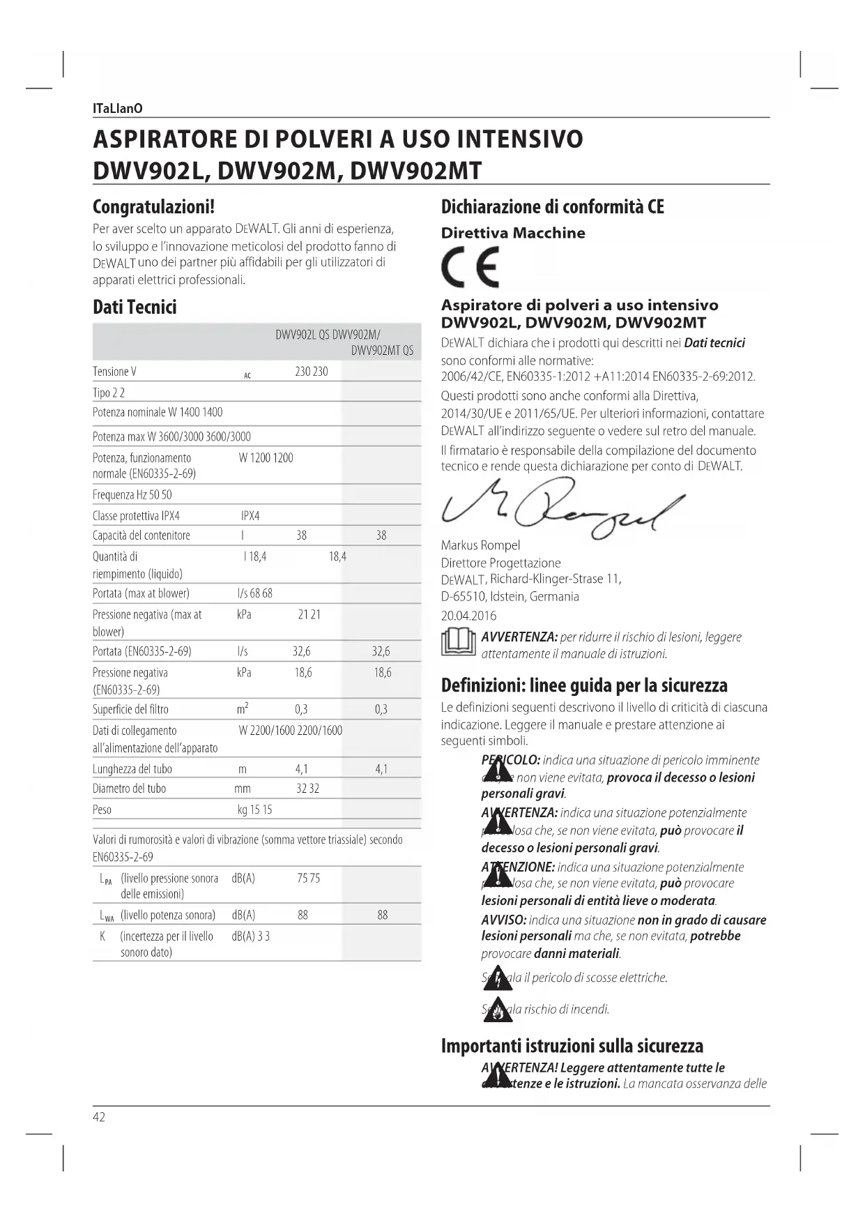 Scarica le istruzioni per il tuo Aspirapolvere in formato PDF gratuitamente! Trova il tuo manuale DWV902L - DEWALT e riprendi in mano il tuo dispositivo elettronico. In questa pagina sono pubblicati tutti i documenti necessari per l'utilizzo del tuo dispositivo. DWV902L del marchio DEWALT.