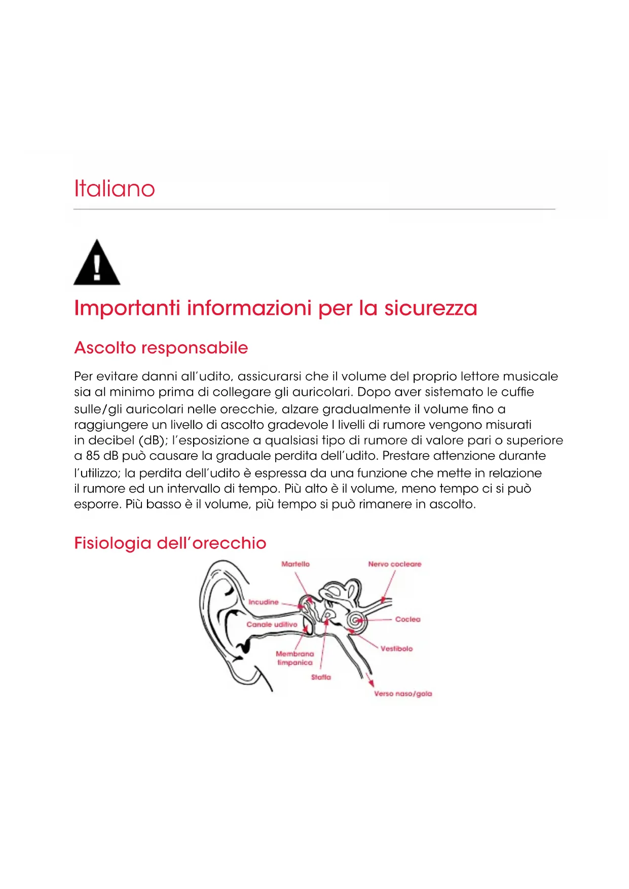 EspañolImportanti informazioni per la sicurezza Ascolto responsabile Per evitare danni all’udito, assicurarsi che il volume del proprio lettore musicale sia al minimo prima di collegare gli auricolari. Dopo aver sistemato le cufe sulle/gli auricolari nelle orecchie, alzare gradualmente il volume no a raggiungere un livello di ascolto gradevole I livelli di rumore vengono misurati in decibel (dB); l’esposizione a qualsiasi tipo di rumore di valore pari o superiore a 85 dB può causare la graduale perdita dell’udito. Prestare attenzione durante l’utilizzo; la perdita dell’udito è espressa da una funzione che mette in relazione il rumore ed un intervallo di tempo. Più alto è il volume, meno tempo ci si può esporre. Più basso è il volume, più tempo si può rimanere in ascolto. Fisiologia dell’orecchio Italiano Martello Nervo cocleare Staffa Membrana timpanica Canale uditivo Coclea Incudine Vestibolo Verso naso/gola34