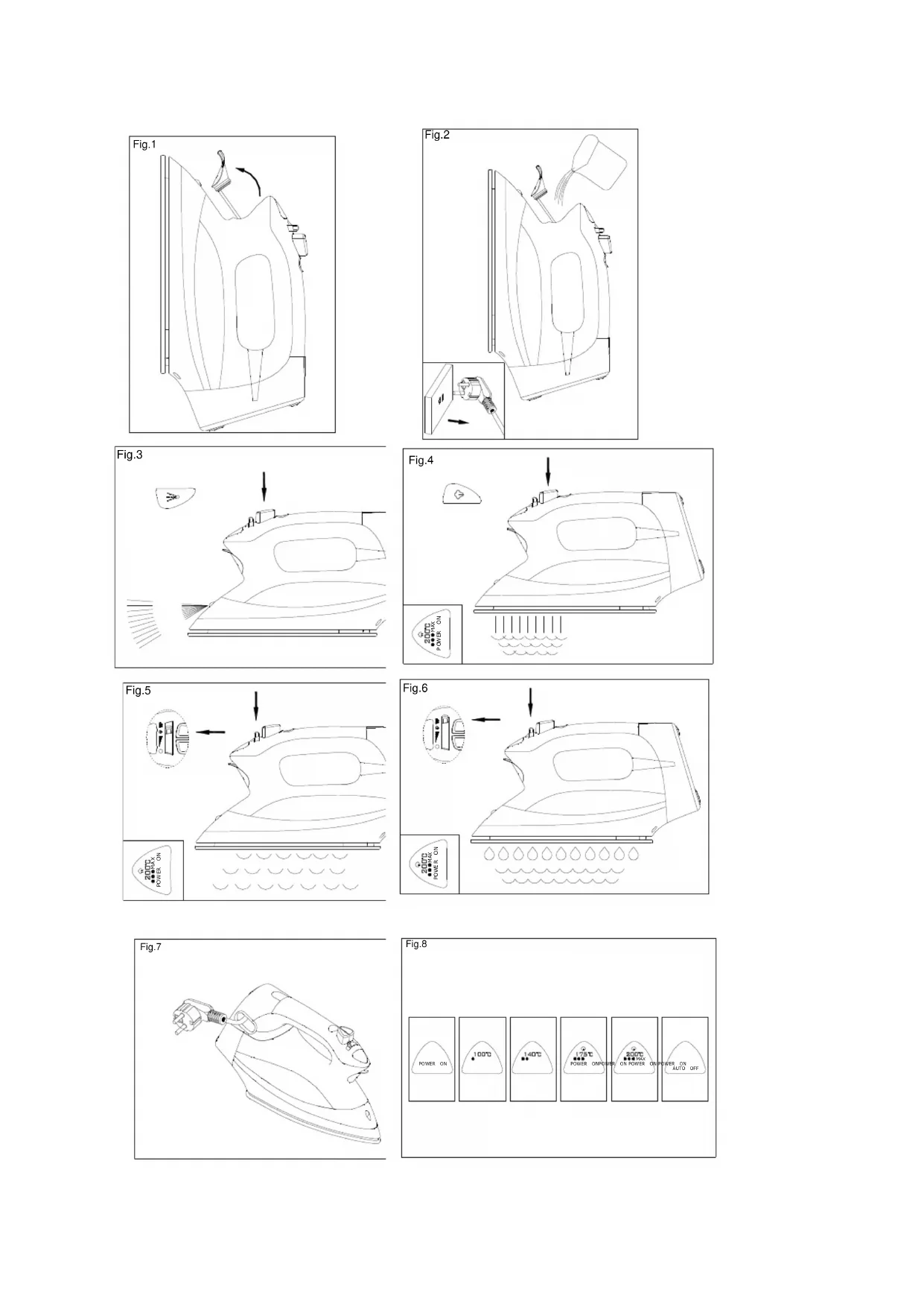 Fig.7 POWER ONAUTO OFFPOWER ONPOWER ON POWER ON POWER ON MAX Fig.8Importante ! Leggere le presenti istruzioni osservando le illustrazioni prima di utilizzare l’apparecchio. Prima di utilizzare il prodotto per la prima volta, verificare che il valore del voltaggio riportato sulla piastrina identificativa corrisponda al voltaggio della rete domestica. Non utilizzare l’apparecchio se danneggiato in qualsiasi modo. Accertarsi che i bambini non tocchino il ferro quando è caldo e che non tirino il cavo di alimentazione. Rimuovere la spina dalla presa prima di riempire il ferro con l’acqua o prima di svuotare l’acqua rimanente dopo l’uso. Non immergere il ferro/l’unità in acqua. Una volta terminata l’operazione di stiratura nonché quando si lascia il ferro incustodito anche per brevi periodi - impostare il selettore del vapore variabile in modo che non ci sia produzione di vapore; - posizionare il ferro in posizione verticale; - rimuovere la spina dalla presa di corrente. Nota: la piastra può danneggiarsi se il ferro viene riposto con la piastra verso il basso. Alcune parti del ferro sono state leggermente ingrassate, pertanto il ferro potrebbe produrre del leggero fumo quando viene acceso per la prima volta. Tale situazione cesserà dopo breve. Prima di utilizzare l'apparecchio per la prima volta, rimuovere tutti gli adesivi e le pellicole protettive dalla piastra e pulirla con un panno morbido. Non inserire aceto o altri agenti anticalcare nel serbatoio dell’acqua. Non utilizzare acqua decalcarizzata chimicamente. Tenere il cavo di alimentazione lontano dalla superficie bollente della piastra. Non cercare di riparare da soli il ferro, la spina o il cavo di alimentazione. Non lasciare il ferro incustodito mentre è collegato alla corrente. Se il cavo di alimentazione è danneggiato, deve essere sostituito dal produttore, da un addetto alla manutenzione o da personale qualificato per evitare pericoli. Il ferro deve essere utilizzato e depositato su una superficie stabile. Quando si posiziona il ferro sulla sua base, assicurarsi che la superficie su cui è collocata la base sia stabile. Non utilizzare il ferro se è caduto, se sono presenti segni visibili di danni o se perde. Tenere gli apparecchi elettrici lontano dalla portata dei bambini o da persone con capacità limitate. Consentire l'uso solo stretta supervisione. Non lasciare il ferro incustodito mentre è collegato alla presa di corrente. Inserire l’acqua (per stiratura a vapore e nebulizzazione)