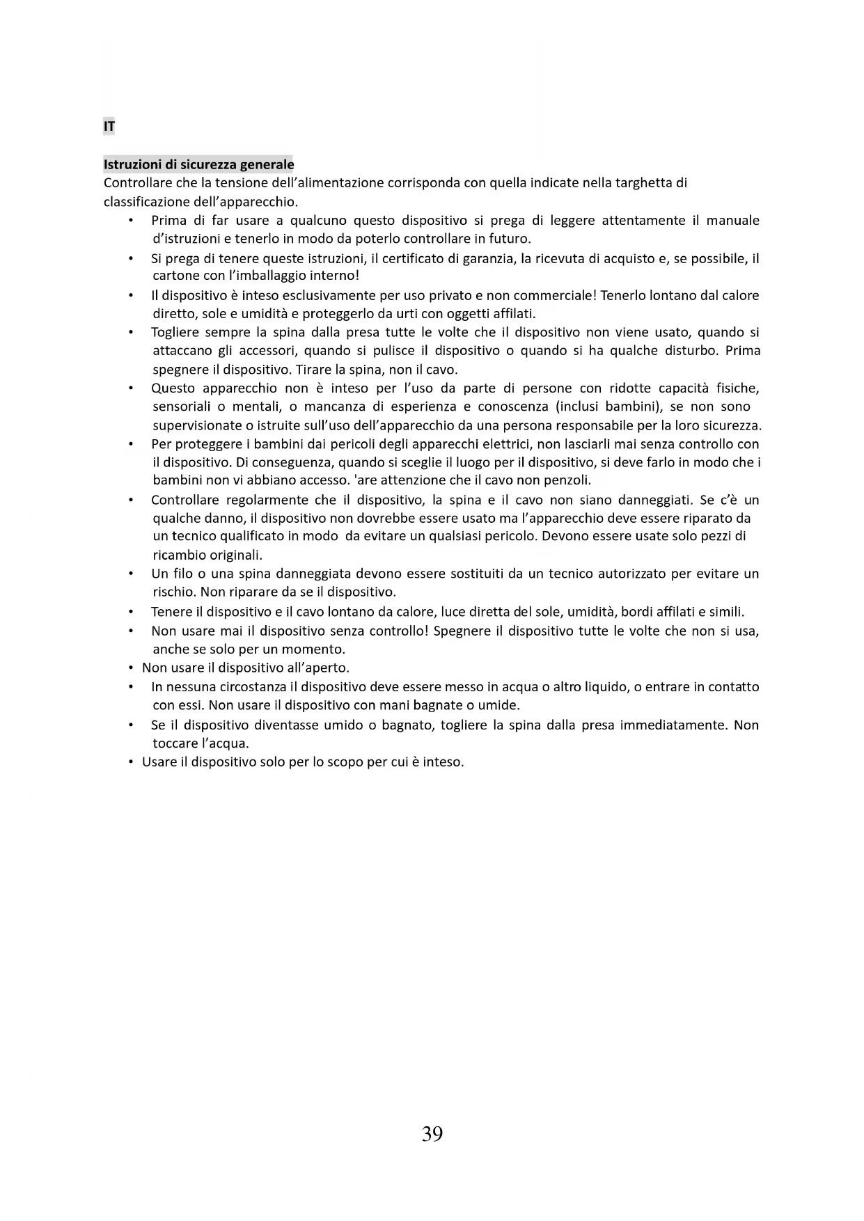 • Il dispositivo è inteso esclusivamente per uso privato e non commerciale! Tenerlo lontano dal calore