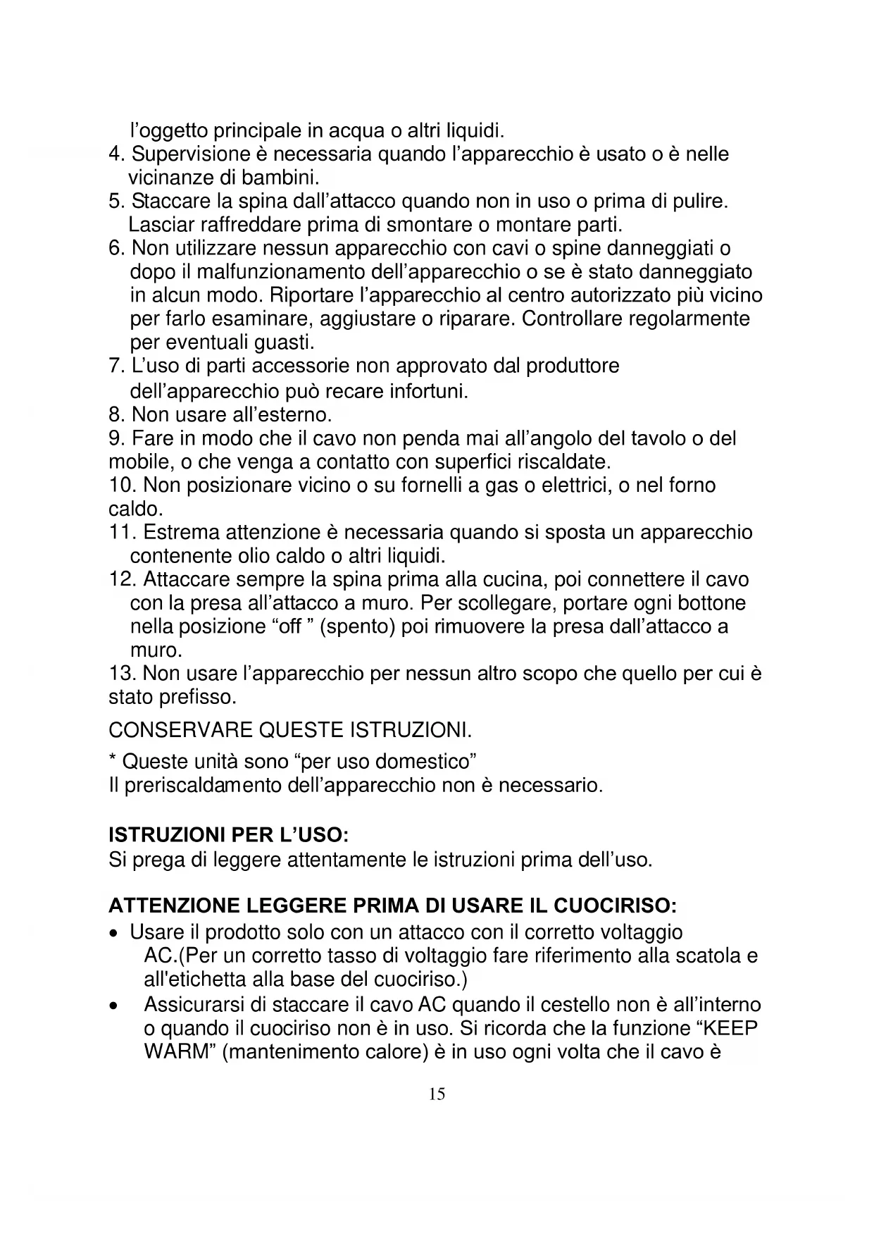 ISTRUZIONI PER L’USO: Si prega di leggere attentamente le istruzioni prima dell’uso. ATTENZIONE LEGGERE PRIMA DI USARE IL CUOCIRISO: Usare il prodotto solo con un attacco con il corretto voltaggio AC.(Per un corretto tasso di voltaggio fare riferimento alla scatola e all'etichetta alla base del cuociriso.) Assicurarsi di staccare il cavo AC quando il cestello non è all’interno o quando il cuociriso non è in uso. Si ricorda che la funzione “KEEP WARM” (mantenimento calore) è in uso ogni volta che il cavo è16 collegato Posizionare il cestello interno nel cuociriso prima di metterlo in funzione. Girare gentilmente il cestello a destra e a sinistra. Se il pulsante di avvio fa resistenza quando lo si mette sulla posizione “cook” (cottura), non provare a forzarlo. Questo in genere succede se, il cestello non è interamente inserito nel cuociriso o se la cottura è appena terminata. Posizionare il coperchio sul cestello interno durante la cottura, riposizionare il coperchio dopo aver servito il riso per prevenire che esso si secchi o scolorisca. Mantenere la base del cestello interno e la superficie del piatto riscaldante al riparo da sostanza esterne per prevenire il malfunzionamento.