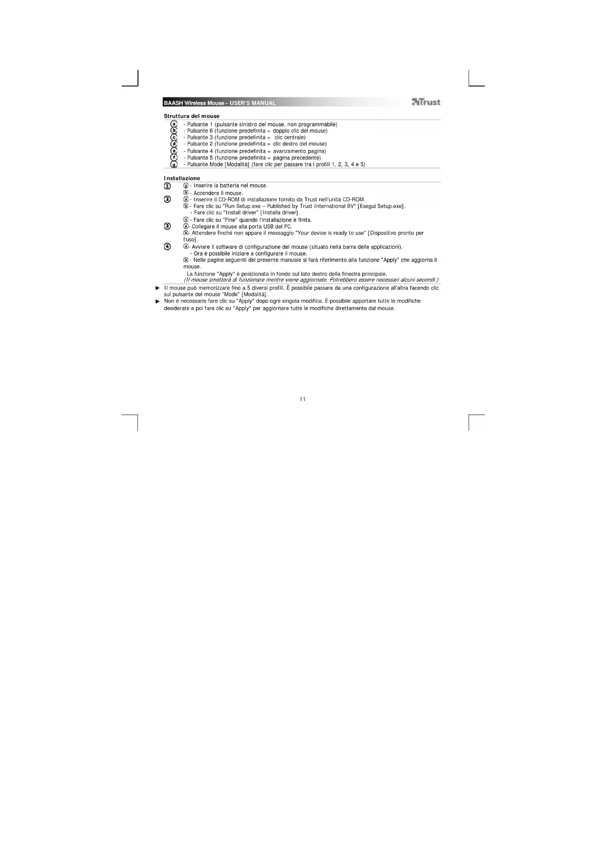 Nelle pagine segunt del presente manuale si farare riferimento alla funzione "Apply" che aggiorna il mouse.