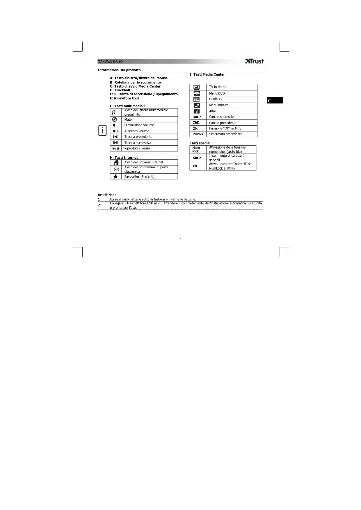 A: Tasto sinistro/destro del mouse. B: Rotellina per lo scorrimento C: Tasto di avvio Media Center D: Trackball E: Pulsante di accensione / spegnimento F: Ricevitore USB G: Tasti multimediali Avvio del lettore multimediale predefinito Muto Diminuzione volume Aumento volume Traccia precedente Traccia successiva Riproduci / Pausa H: Tasti Internet Avvio del browser Internet Avvio del programma di posta elettronica Favourites (Preferiti)