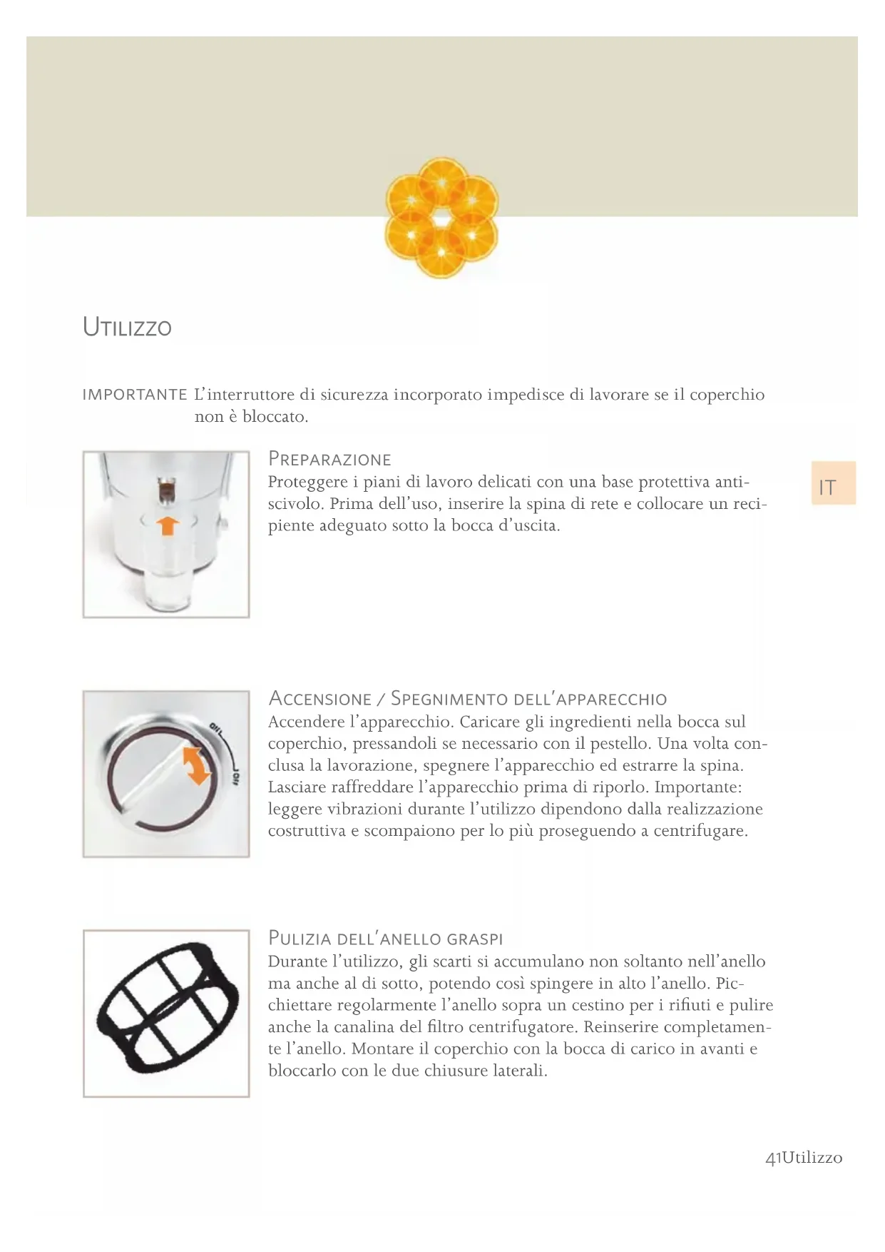 Durante l'utilizzo, gli scarti si accumulano non soltanto nell'anello maanche al di fatto, potendoosi spingere in alto I'anello. Picchiettare regolarmente I'anello sopra un cestino per i rifiuti e pulire ancche la canalina del filtrio centrifugatore. Reinserire completamente I'anello. Montare il coperchio con la bocca di carico in avanti e bloccarlo con le due chiusure laterali.