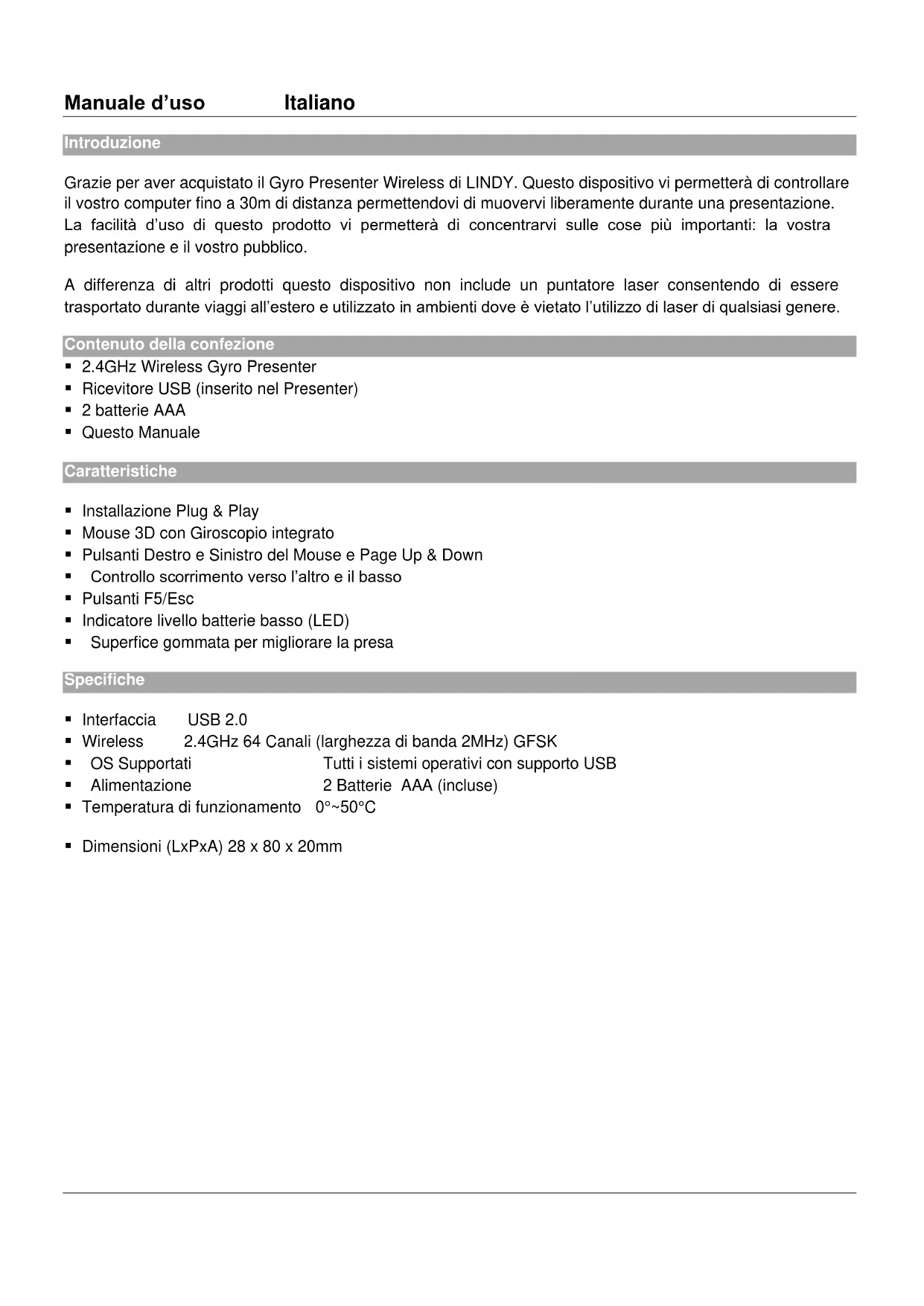 OFF ResetManuale d’uso Italiano Introduzione Grazie per aver acquistato il Gyro Presenter Wireless di LINDY. Questo dispositivo vi permetterà di controllare il vostro computer fino a 30m di distanza permettendovi di muovervi liberamente durante una presentazione. La facilità d’uso di questo prodotto vi permetterà di concentrarvi sulle cose più importanti: la vostra presentazione e il vostro pubblico. A differenza di altri prodotti questo dispositivo non include un puntatore laser consentendo di essere trasportato durante viaggi all’estero e utilizzato in ambienti dove è vietato l’utilizzo di laser di qualsiasi genere. Contenuto della confezione 2.4GHz Wireless Gyro Presenter Ricevitore USB (inserito nel Presenter) 2 batterie AAA Questo Manuale Caratteristiche Installazione Plug & Play Mouse 3D con Giroscopio integrato Pulsanti Destro e Sinistro del Mouse e Page Up & Down Controllo scorrimento verso l’altro e il basso Pulsanti F5/Esc Indicatore livello batterie basso (LED) Superfice gommata per migliorare la presa Specifiche Interfaccia USB 2.0 Wireless 2.4GHz 64 Canali (larghezza di banda 2MHz) GFSK OS Supportati Tutti i sistemi operativi con supporto USB Alimentazione 2 Batterie AAA (incluse) Temperatura di funzionamento 0°~50°C Dimensioni (LxPxA) 28 x 80 x 20mmManuale d’uso Italiano