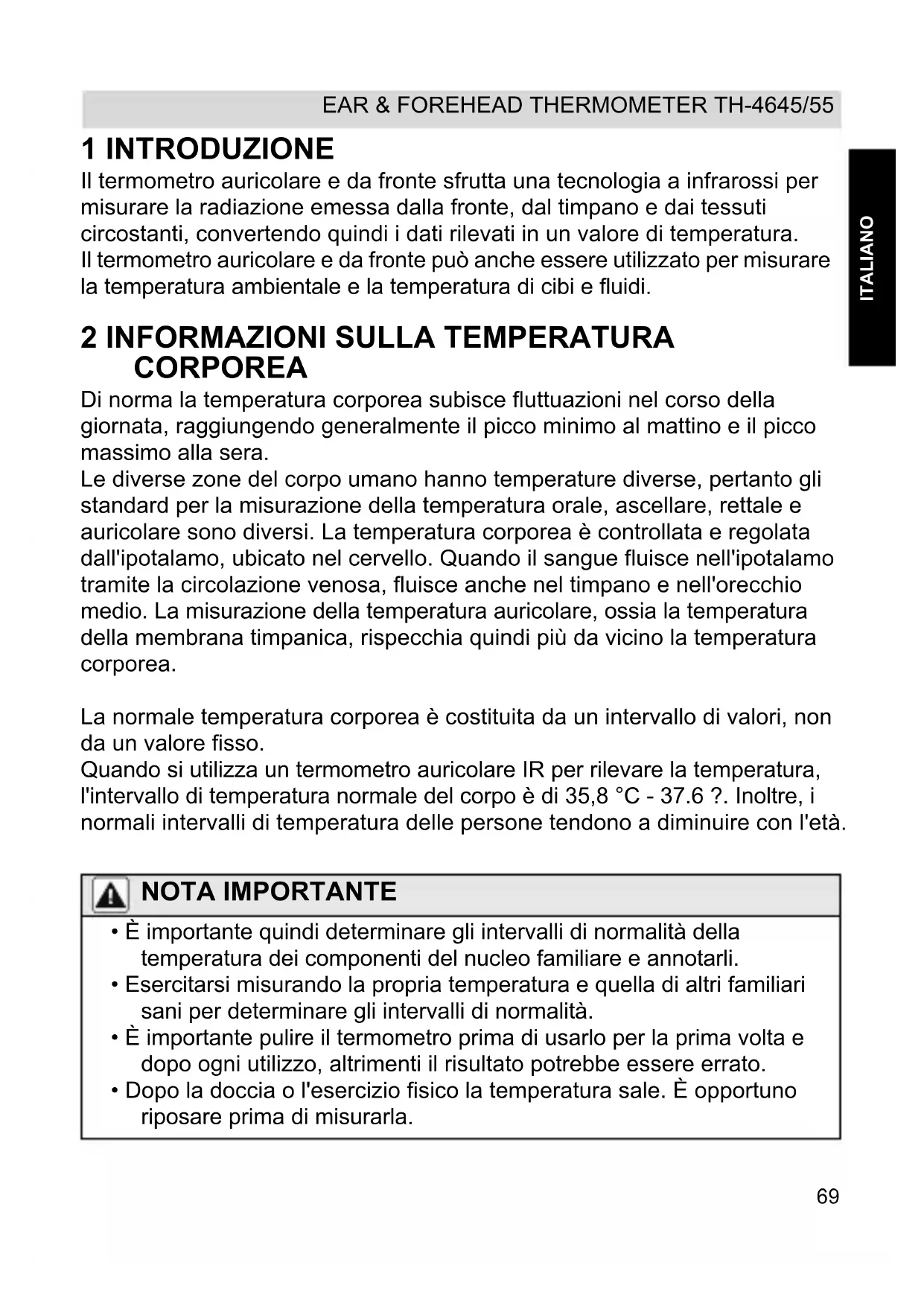 ITALIANO 1 INTRODUZIONE Il termometro auricolare e da fronte sfrutta una tecnologia a infrarossi per misurare la radiazione emessa dalla fronte, dal timpano e dai tessuti circostanti, convertendo quindi i dati rilevati in un valore di temperatura. Il termometro auricolare e da fronte può anche essere utilizzato per misurare la temperatura ambientale e la temperatura di cibi e fluidi.