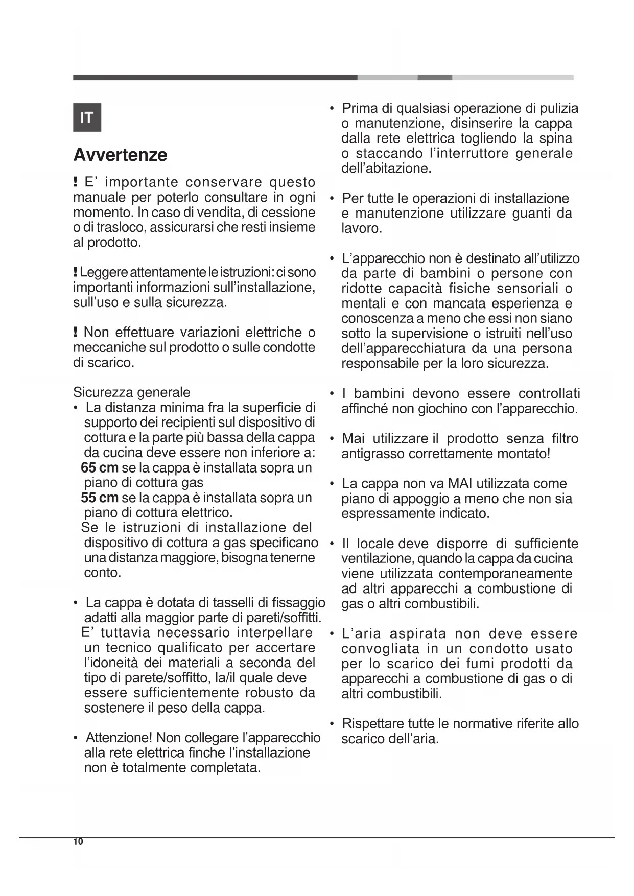 - Prima di qualsiasi operazione di pulizia o manutenzione, disinserire la cappa dalla rete elettrica togliendo la spina o staccando l’interruttore generale dell’abitazione.