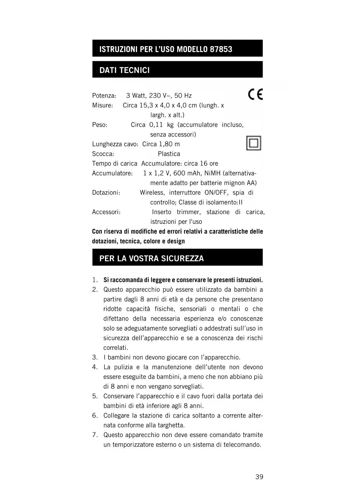 controllo; Classe di isolamento:II Accessori: Inserto trimmer, stazione di carica,